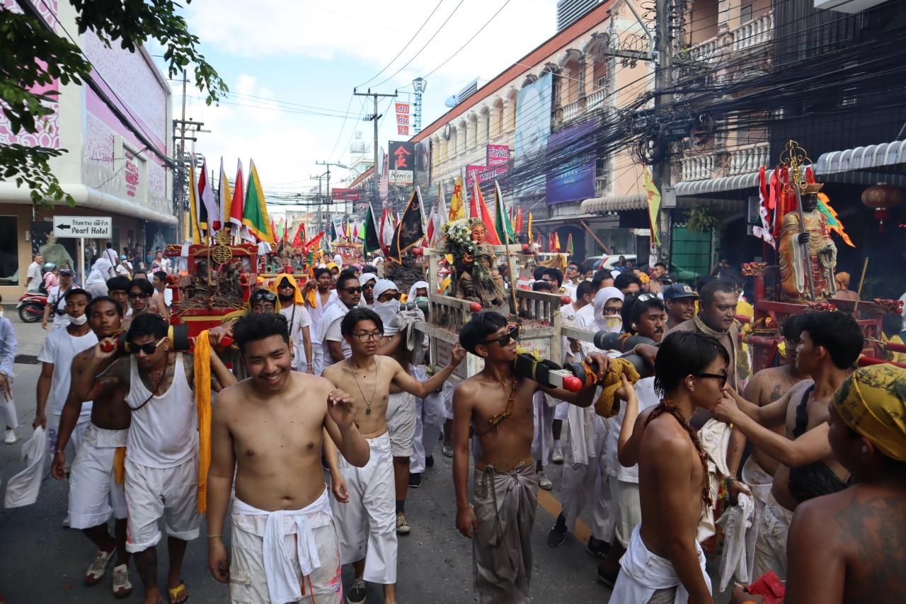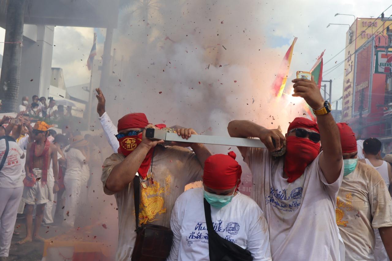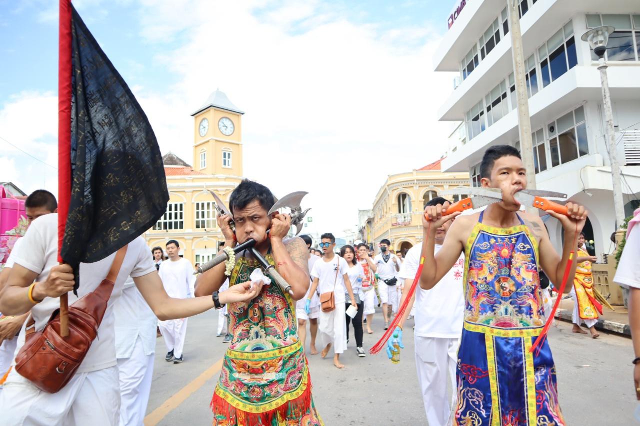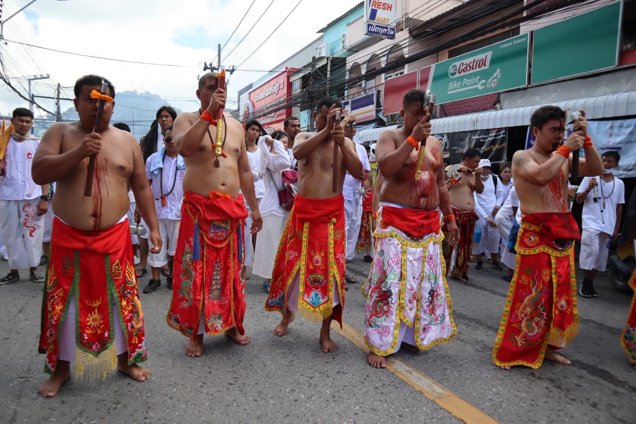 ทั้งนี้ ม้าทรงชายหญิงในขบวนเกือบ 100 คนยังคงใช้อาวุธทั้งในและนอกตำนานทรมานร่างกายอย่างน่าหวาดเสียว เพื่อรับเคราะห์แทนผู้ร่วมถือศีลกินผัก ทันทีที่ขบวนผ่านประชาชนและนักท่องเที่ยว ส่วนใหญ่มีทั้งชาวจีน มาเลเซีย และสิงคโปร์ ได้นำประทัดมาจุดใส่ไท่เปี๋ย หรือเสลี่ยงพระเล็ก เสียงดังสนั่นหวั่นไหว เพื่อความเป็นมงคลตามความเชื่อ อย่างไรก็ตาม ในช่วงค่ำวันเดียวกัน แต่เวลา 22.00 น.เป็นต้นไป ทุกศาลเจ้าจะมีการประกอบพิธีส่งกิ๋วอ๋องไต่เต่กลับสรวงสวรรค์