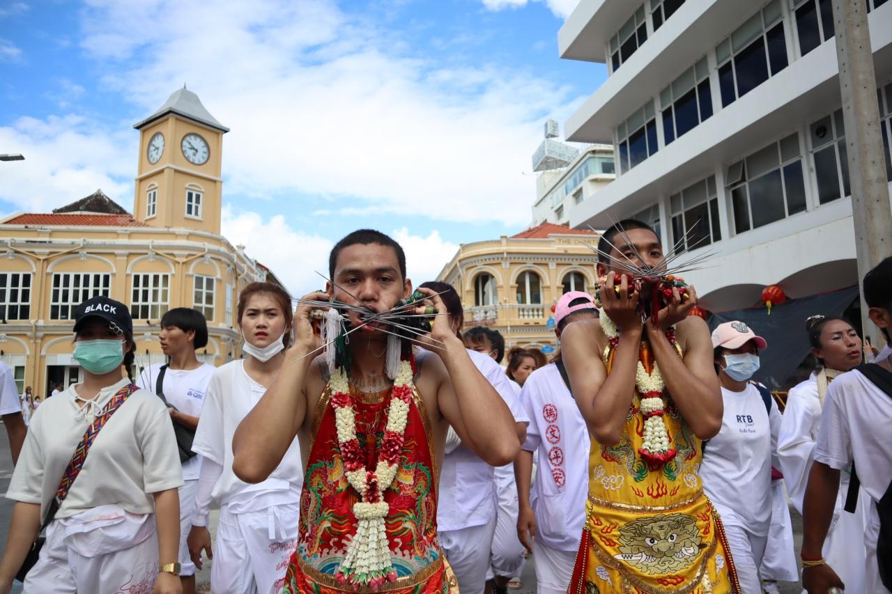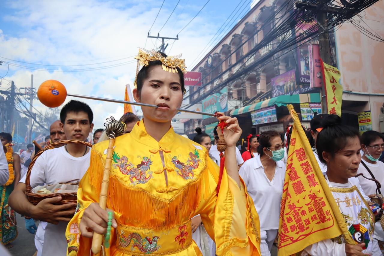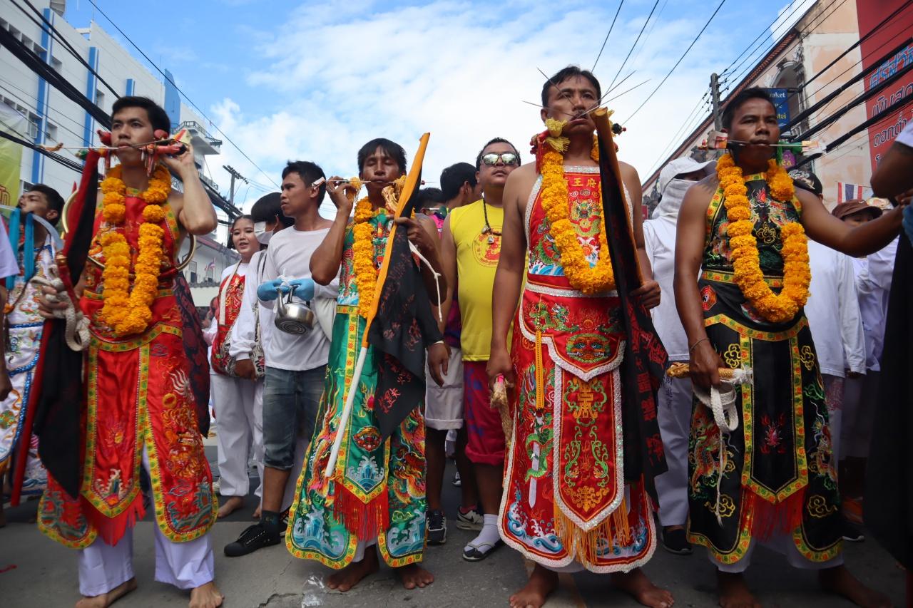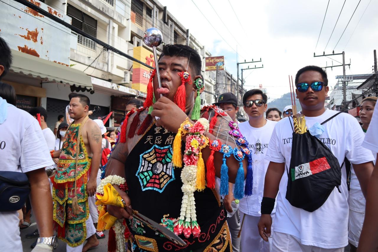 ทั้งนี้ ม้าทรงชายหญิงในขบวนเกือบ 100 คนยังคงใช้อาวุธทั้งในและนอกตำนานทรมานร่างกายอย่างน่าหวาดเสียว เพื่อรับเคราะห์แทนผู้ร่วมถือศีลกินผัก ทันทีที่ขบวนผ่านประชาชนและนักท่องเที่ยว ส่วนใหญ่มีทั้งชาวจีน มาเลเซีย และสิงคโปร์ ได้นำประทัดมาจุดใส่ไท่เปี๋ย หรือเสลี่ยงพระเล็ก เสียงดังสนั่นหวั่นไหว เพื่อความเป็นมงคลตามความเชื่อ อย่างไรก็ตาม ในช่วงค่ำวันเดียวกัน แต่เวลา 22.00 น.เป็นต้นไป ทุกศาลเจ้าจะมีการประกอบพิธีส่งกิ๋วอ๋องไต่เต่กลับสรวงสวรรค์