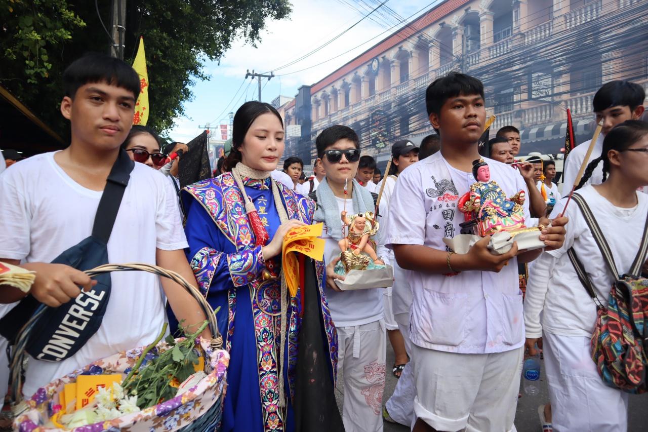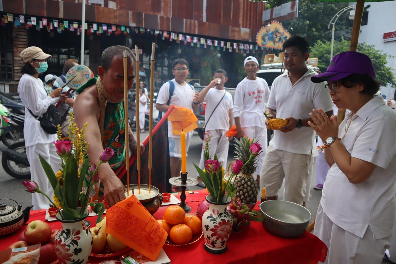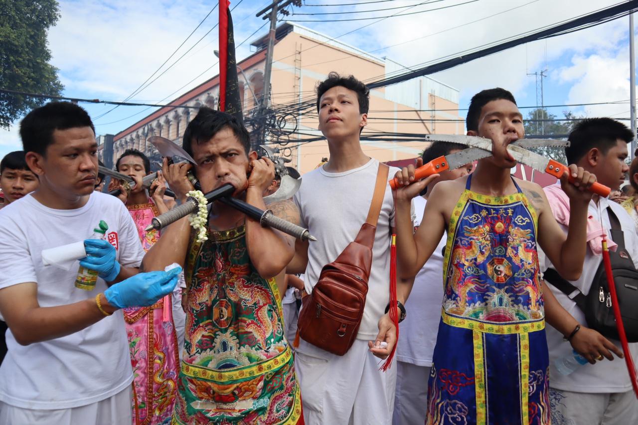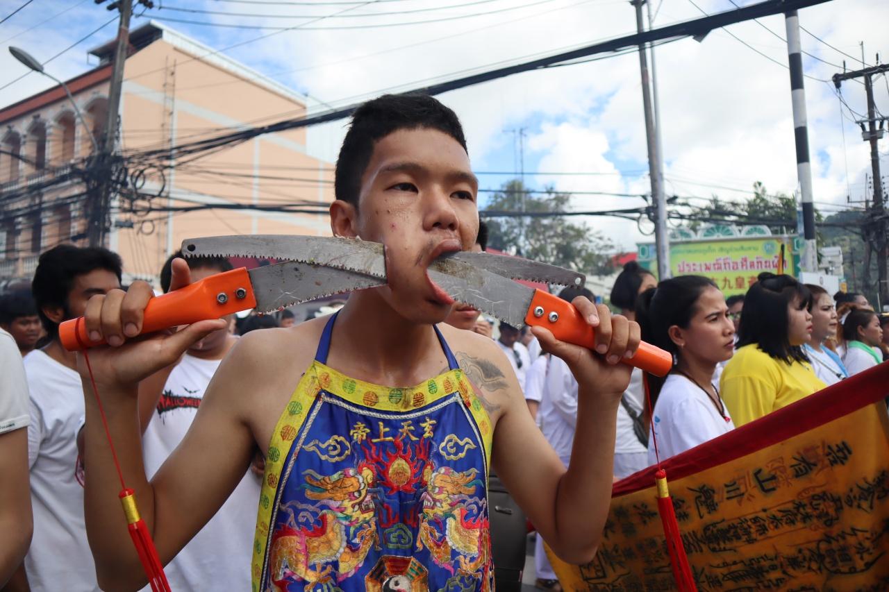 ทั้งนี้ ม้าทรงชายหญิงในขบวนเกือบ 100 คนยังคงใช้อาวุธทั้งในและนอกตำนานทรมานร่างกายอย่างน่าหวาดเสียว เพื่อรับเคราะห์แทนผู้ร่วมถือศีลกินผัก ทันทีที่ขบวนผ่านประชาชนและนักท่องเที่ยว ส่วนใหญ่มีทั้งชาวจีน มาเลเซีย และสิงคโปร์ ได้นำประทัดมาจุดใส่ไท่เปี๋ย หรือเสลี่ยงพระเล็ก เสียงดังสนั่นหวั่นไหว เพื่อความเป็นมงคลตามความเชื่อ อย่างไรก็ตาม ในช่วงค่ำวันเดียวกัน แต่เวลา 22.00 น.เป็นต้นไป ทุกศาลเจ้าจะมีการประกอบพิธีส่งกิ๋วอ๋องไต่เต่กลับสรวงสวรรค์