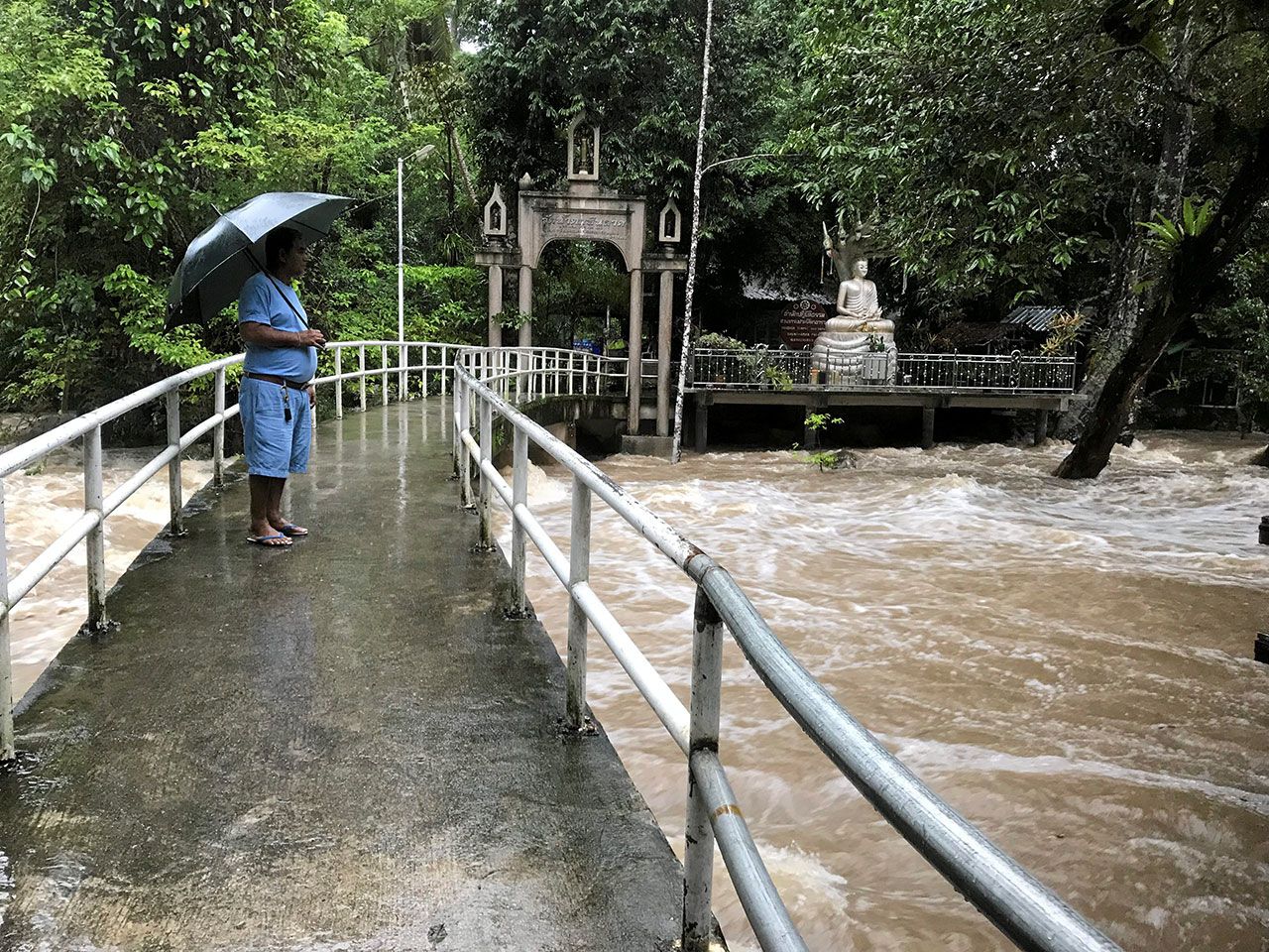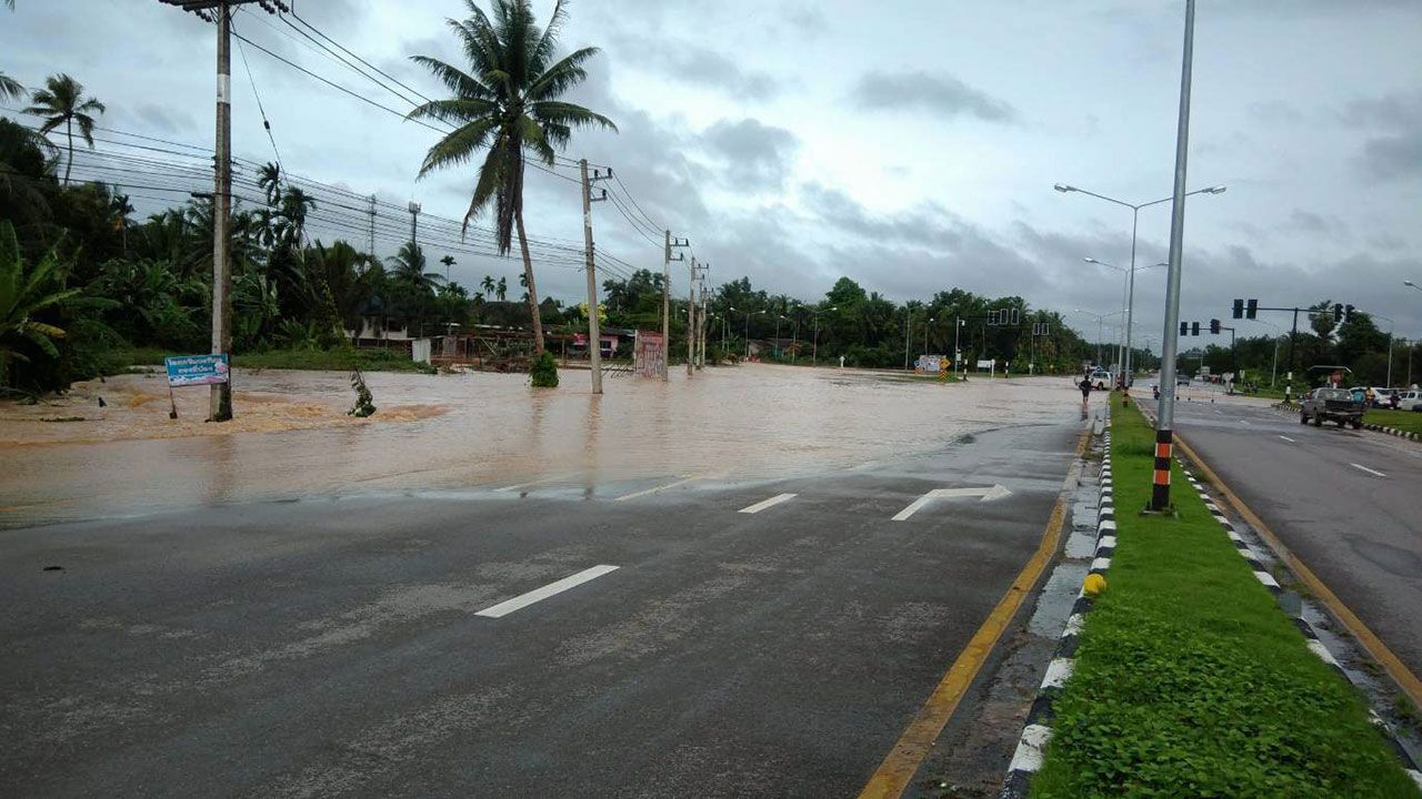 ภาคใต้ยังมีฝนตกต่อเนื่อง ส่งผลให้น้ำท่วมหลายจังหวัด เปิดเผยเมื่อเวลา 13.00 น. วันที่ 10 พ.ย. เกิดฝนตกลงมาอย่างต่อเนื่องในพื้นที่ อ.เกาะสมุย จ.สุราษฎร์ธานี ส่งผลให้เกิดน้ำป่าจากภูเขาไหลเชี่ยวลงมายังน้ำตกหินลาด หมู่ 3 ต.อ่างทอง อ.เกาะสมุย เป็นแหล่งท่องเที่ยว ด้านว่าที่ ร.ต.กิตติภพ รอดดอน นายอำเภอเกาะสมุย เปิดเผยว่า พื้นที่ อ.เกาะสมุย มีฝนตกลงมาอย่างต่อเนื่อง ทำให้ปริมาณน้ำฝนที่สะสมอยู่บนภูเขาไหลลงมาด้านล่าง โดยเฉพาะพื้นที่ที่เป็นน้ำตกจะมีกระแสน้ำไหลแรง เจ้าหน้าที่แจ้งเตือนห้ามนักท่องเที่ยวลงเล่นน้ำตก หรือเข้าใกล้บริเวณลำธารมีกระแสน้ำไหลแรงในระยะนี้ นอกจากนี้ ปริมาณน้ำที่ไหลลงมาจากภูเขา เข้าท่วมถนนสายรอบเกาะสมุยเป็นบางจุดแล้ว เนื่องจากน้ำระบายลงสู่ทะเลไม่ทัน