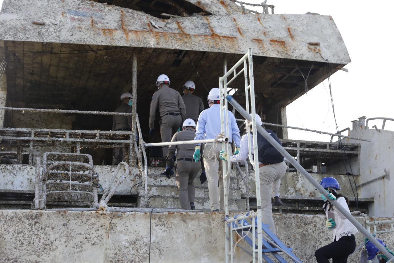 จากการตรวจสอบทางกายภาพด้วยสายตา พบก้อนหินและแท่งซีเมนต์ ซึ่งในส่วนนี้จะให้ทีมวิศวกรเข้าตรวจสอบเพื่อคำนวณปริมาณก้อนหินและสิ่งต่างๆ ที่พบ ว่าจะมีผลต่อเรืออย่างไรบ้าง ผลการตรวจสอบจะเป็นหลักฐานทางวิทยาศาสตร์