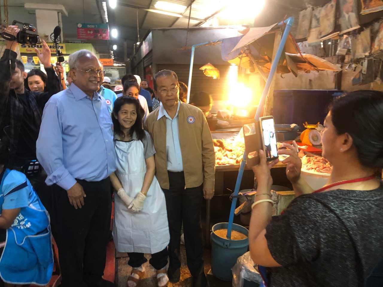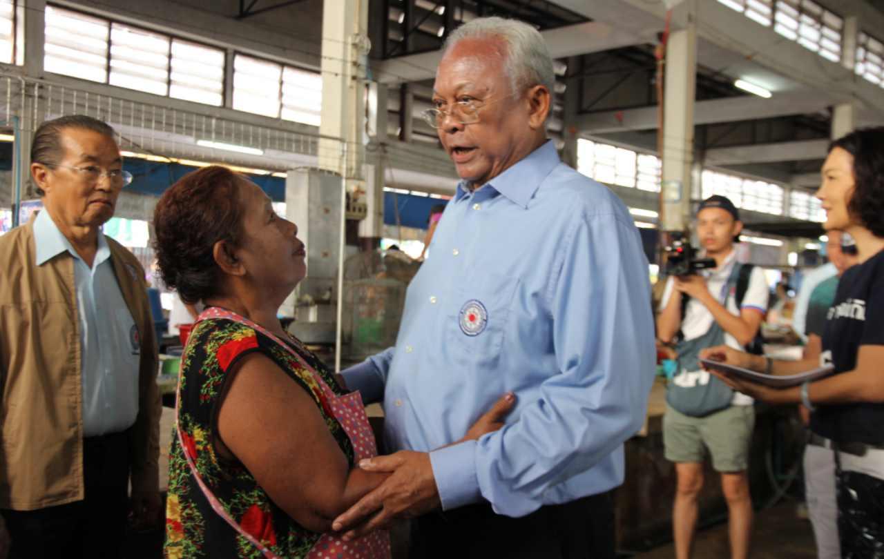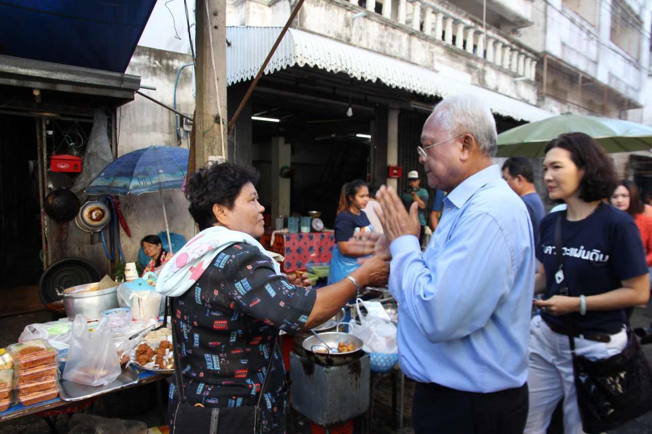 หลังจากนั้น นายสุเทพ และคณะเดินเท้าไปยังตลาดสดเทศบาลนครสุราษฎร์ธานี เข้าพบปะพ่อค้าแม่ค้าและประชาชนตามแผงขายของในตัวตลาด และเดินข้ามฟากไปยังตลาดศรีไชยา โดยมีแม่ค้าบางรายที่นั่งอยู่ในแผงตะโกนข้ามแผงว่า ลุงกำนันสู้ๆ โดยนายสุเทพได้ตอบกลับว่า เราต้องช่วยกัน และมีพ่อค้าแม่ค้าหลายรายฝากนายสุเทพ เรื่องความเดือดร้อนจากปัญหาเศรษฐกิจ ทั้งเรื่องยางพารา การค้าขาย และการจัดระเบียบแผงลอย ซึ่งนายสุเทพกล่าวสั้นๆ ว่าจะไม่ทิ้งกัน