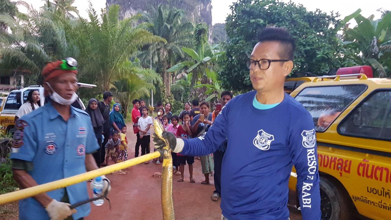 ทางด้าน เจ้าหน้าที่กู้ภัยเข้าค้นหาภายในสวนปาล์มนาน 15 นาที พบงูตัวดังกล่าวนอนขดตัวอยู่ในโพรงดินในสวนปาล์ม โดยงูมีอาการดุร้าย จึงใช้ไม้ยาวติดบ่วงเชือกคล้องเอาตัวออกมา งูตัวดังกล่าวเป็นงูจงอาง วัดความยาวได้กว่า 4 เมตร คาดเป็นจงอางเพศผู้ มีสภาพผอม เชื่อว่าเป็นงูที่อาศัยอยู่ในป่าใกล้หมู่บ้าน ออกมาหาอาหารกิน แต่ชาวบ้านพบเห็นก่อน เจ้าหน้าที่จึงนำตัวใส่ถุงกระสอบ นำไปปล่อยในป่าจุดอื่นต่อไป.