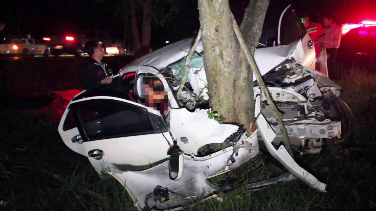 สาววัย 28 ปี ขับรถเก๋งมาคนเดียวกลางดึก เกิดเสียหลักตกร่องกลางทางถนนสายเอเชียช่วง อ.สวี ชุมพร ชนต้นไม้เต็มแรง ยังดีแค่บาดเจ็บ พบรอยล้อพุ่งลงถนน ชี้อาจหลับใน