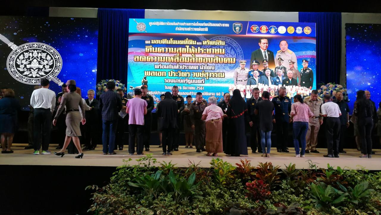เมื่อวันที่ 26 ธ.ค.2561 ที่หอประชุมนานาชาติฉลองสิริราชสมบัติครบ 60 ปีมหาวิทยาลัยสงขลานครินทร์ อ.หาดใหญ่ จ.สงขลา พล.อ.ประวิตร วงศ์สุวรรณ รองนายกรัฐมนตรีและรัฐมนตรีว่าการกระทรวงกลาโหม เป็นประธานมอบคืนโฉนดที่ดินและทรัพย์สิน คืนความสุขให้ประชาชนลดความเหลื่อมล้ำของสังคม ครั้งที่ 6 พร้อมกันทั่วประเทศ หลังเปิดยุทธการขุดรากถอนโคนอาชญากรรม ทำบ้านเมืองน่าอยู่ มีประชาชนและข้าราชการเข้าร่วมจาก 7 จังหวัดภาคใต้ตอนล่าง 1500 คน