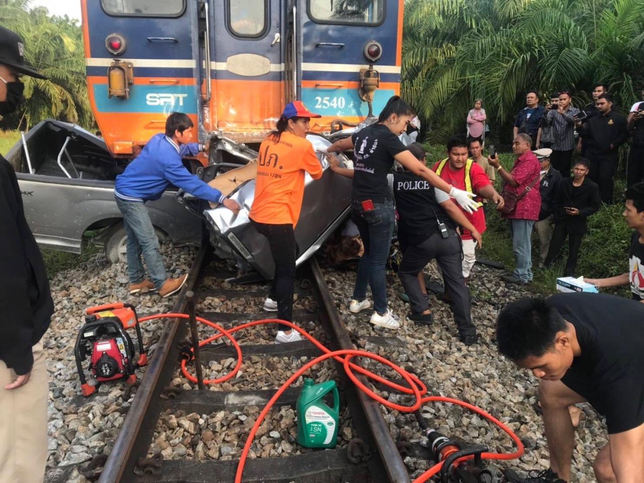รถไฟสายใต้ กทม.-ยะลา ขยี้กระบะสองแม่ลูกขณะขับรถไฟส่งลูกไปโรงเรียนที่ ต.คันธุลี อ.ท่าชนะ จ.สุราษฎร์ธานี เละทั้งคันตายคาที่ 2 ศพ ตร.คาดผู้ตายไม่ชินเส้นทาง...