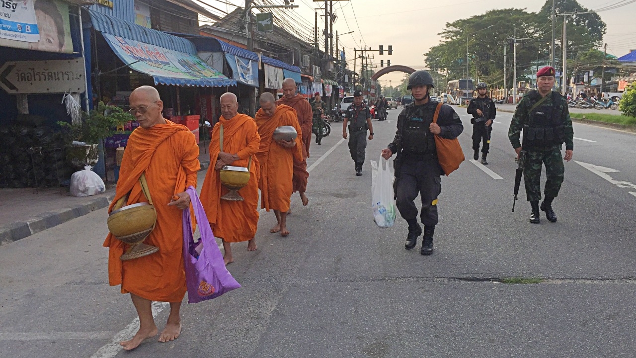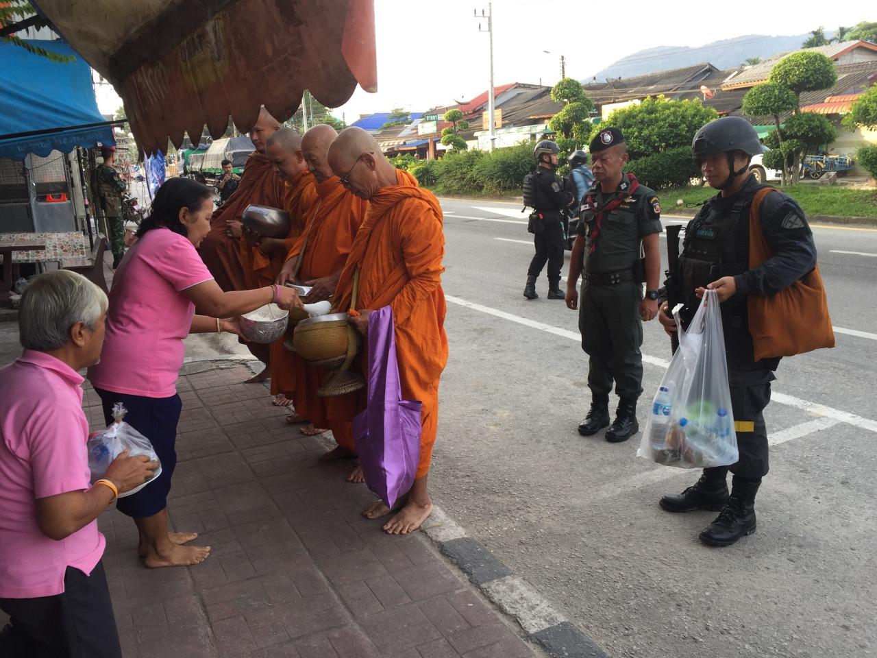 ขณะที่บริเวณสองข้างทางได้มีชาวบ้านไทยพุทธมายืนรอทำบุญใส่บาตรค่อนข้างบางตา เนื่องจากเหลือครอบครัวไทยพุทธอยู่ไม่ถึง 10 ครอบครัว โดยมีเจ้าหน้าที่ทหารพรานนาวิกโยธินกองทัพเรือ, เจ้าหน้าที่ตำรวจ สภ.บาเจาะ และเจ้าที่ทหารชุดพัฒนาสันติ กระจายกำลังกันมาดูแลรักษาความปลอดภัยอย่างแน่นหนาเช่นกัน เพื่อป้องกันเหตุร้ายที่อาจจะเกิดขึ้น