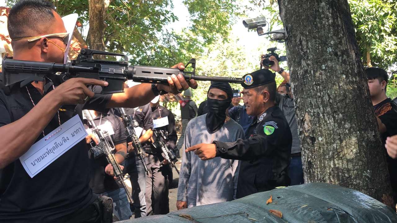 นำผู้ต้องหาร่วมยิงถล่มป้อมยามปล้นปืน 10 กระบอก ที่สายบุรี ปัตตานี เมื่อปี 49 ตำรวจตาย 3 คนร้ายโดนจับตาย 2 บาดเจ็บ 1 หนีอยู่ 13 ปี ทำแผน สารภาพโดนเพื่อนปัสสาวะกรอกปาก อ้างรักษาแผล