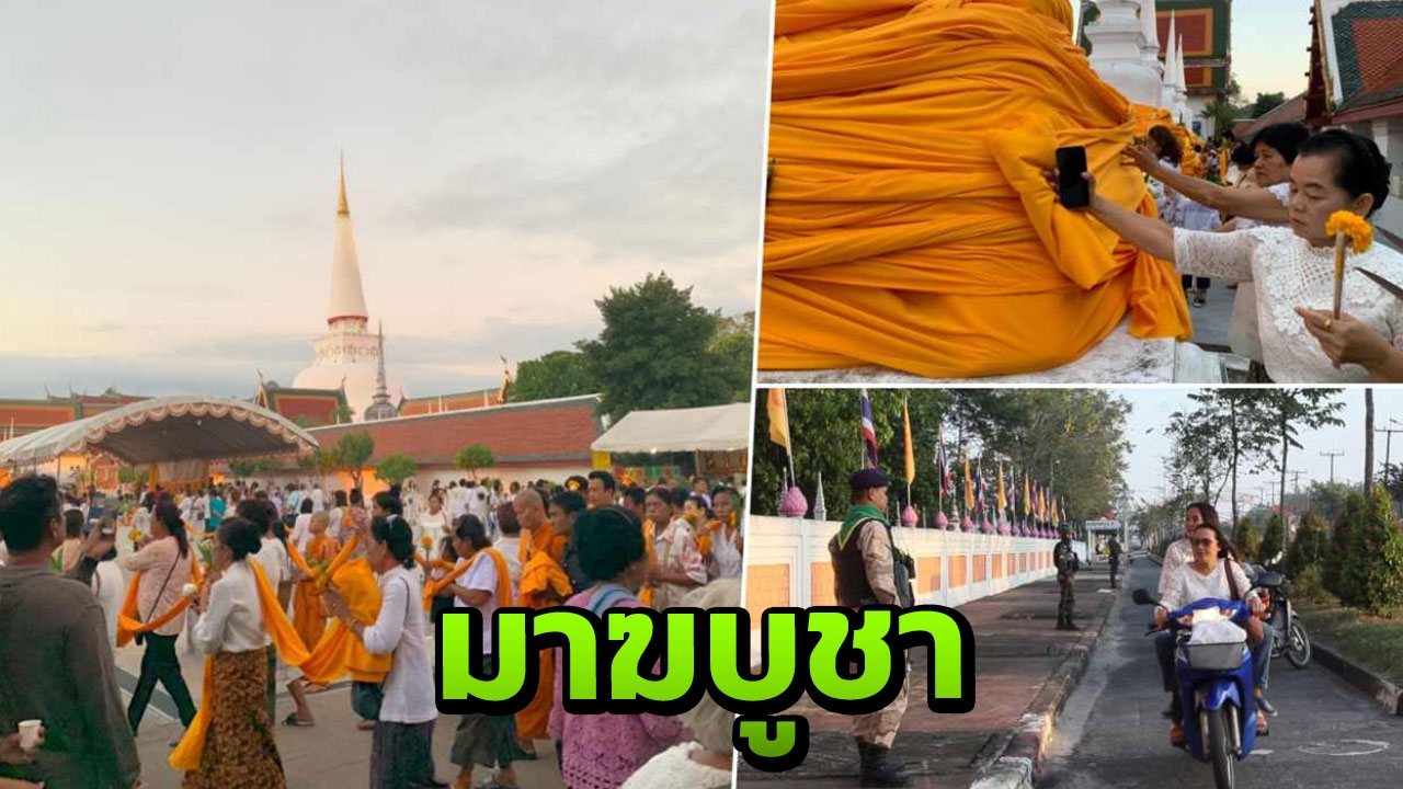 พุทธศาสนิกชน ร่วมแห่ผ้าพระบฏ ขึ้นห่มองค์พระบรมธาตุเจดีย์ นครศรีธรรมราช บุญใหญ่ในวันมาฆบูชา ส่วนยะลา ผวจ. นำตักบาตรทำบุญ ที่วัดพระอารามหลวง ท่ามกลางการดูแลของเจ้าหน้าที่