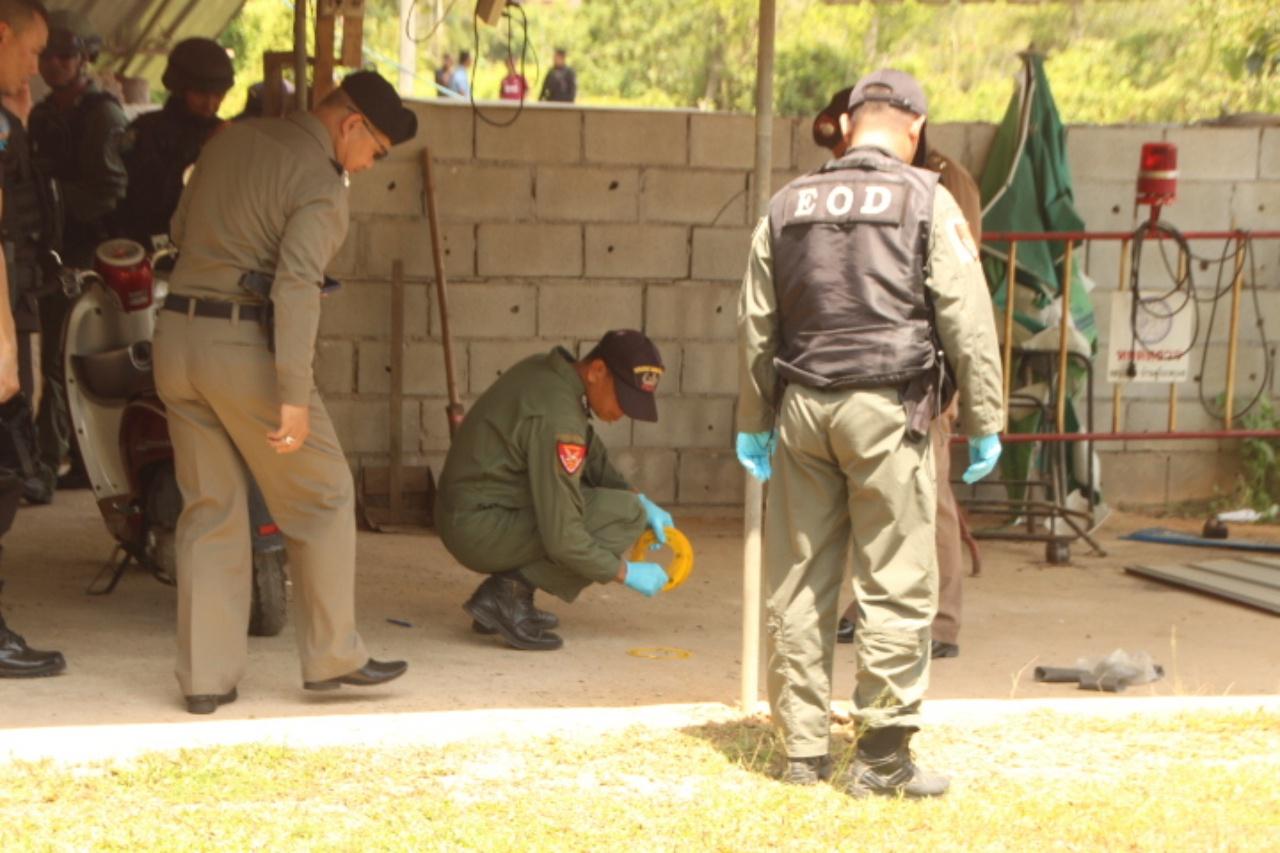 พบที่บริเวณพื้นข้างเสาของตัวอาคารที่พักของ ชรบ.ด้านขวามือของประตูทางเข้า มีร่องรอยของระเบิดแสวงเครื่องแบบไปป์บอมบ์ ซึ่งประกอบใส่ไว้ในท่อเหล็กทรงกลม หนักประมาณ 1 กก. ที่คนร้ายได้ผลิตเองตก ได้ตกลงมาโดยสะเก็ดระเบิดได้กระเด็นไปถูกฝาผนังปูนของที่พักเป็นรูพรุน โดยมีเศษซากชิ้นส่วนของระเบิดได้กระเด็นคลุกเคล้ากับเหล็กเส้นตัดสั้น พร้อมด้วยกระเดื่องของระเบิดแสวงเครื่อง 1 อันตกอยู่ เจ้าหน้าที่จึงได้เก็บรวบรวมไว้เป็นหลักฐาน