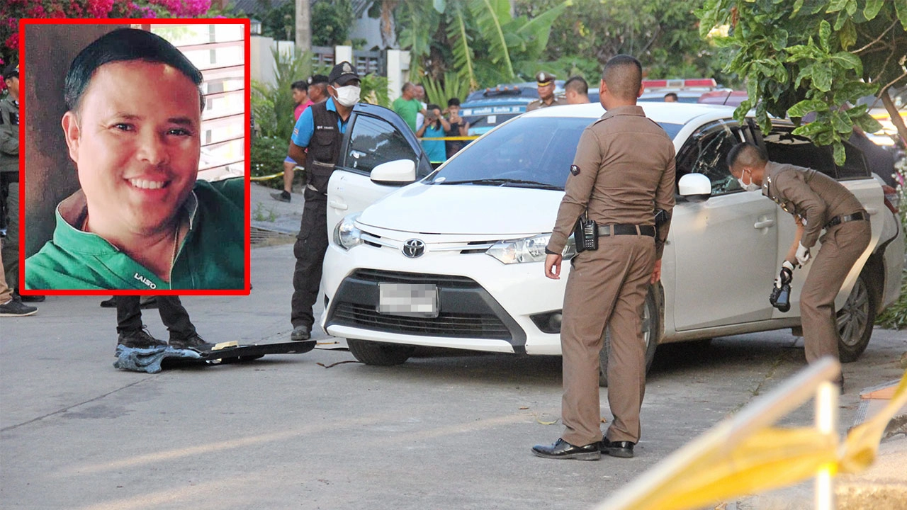 เจ้าหน้าที่ตรวจรถเก๋งโตโยต้า วีออส ของ ร.ต.อ.วัชรินทร์ เบญจทศวรรษ (รูปเล็ก) อดีตฝ่ายสืบสวนสงขลา ถูกคนร้ายยิงเสียชีวิตที่หน้าบ้านใน จ.สงขลา คาดปมเหตุหลังออกจากราชการ ผันตัวเองมาเป็นจอมแฉตำรวจนอกรีต.