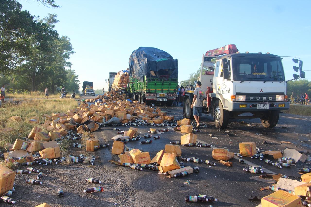 จากการตรวจสอบที่เกิดเหตุ พบรถบรรทุก 10 ล้อฮีโน่ สีเขียว ทะเบียน 70-7983 สมุทรสาคร บรรทุกอะไหล่รถยนต์และของเบ็ดเตล็ดมาเต็มคันรถจอดริมถนน หน้ารถพุ่งชนอัดท้ายรถเทรลเลอร์ 18 ล้อ อีซูซุ สีขาว ทะเบียน 81-0757 ชุมพร ที่บรรทุกน้ำปลามาเต็มคันรถรวม 36 ตัน สภาพพังยับเยิน น้ำมันเครื่องไหลนองพื้นถนน ชิ้นส่วนอะไหล่หน้ารถกระจายเกลื่อนถนน นอกจากนี้ยังพบขวดน้ำปลาและลังบรรจุน้ำปลาของรถเทรลเลอร์ที่ถูกชนท้ายตกกระจายเต็มถนน