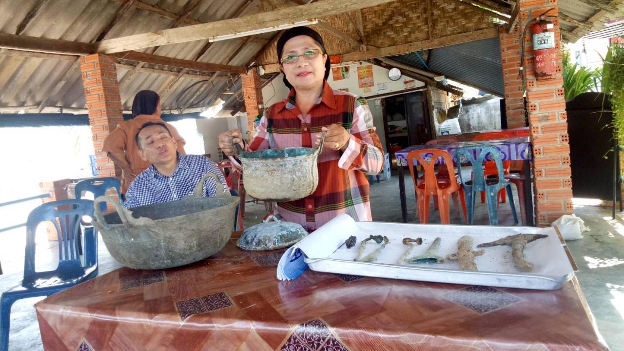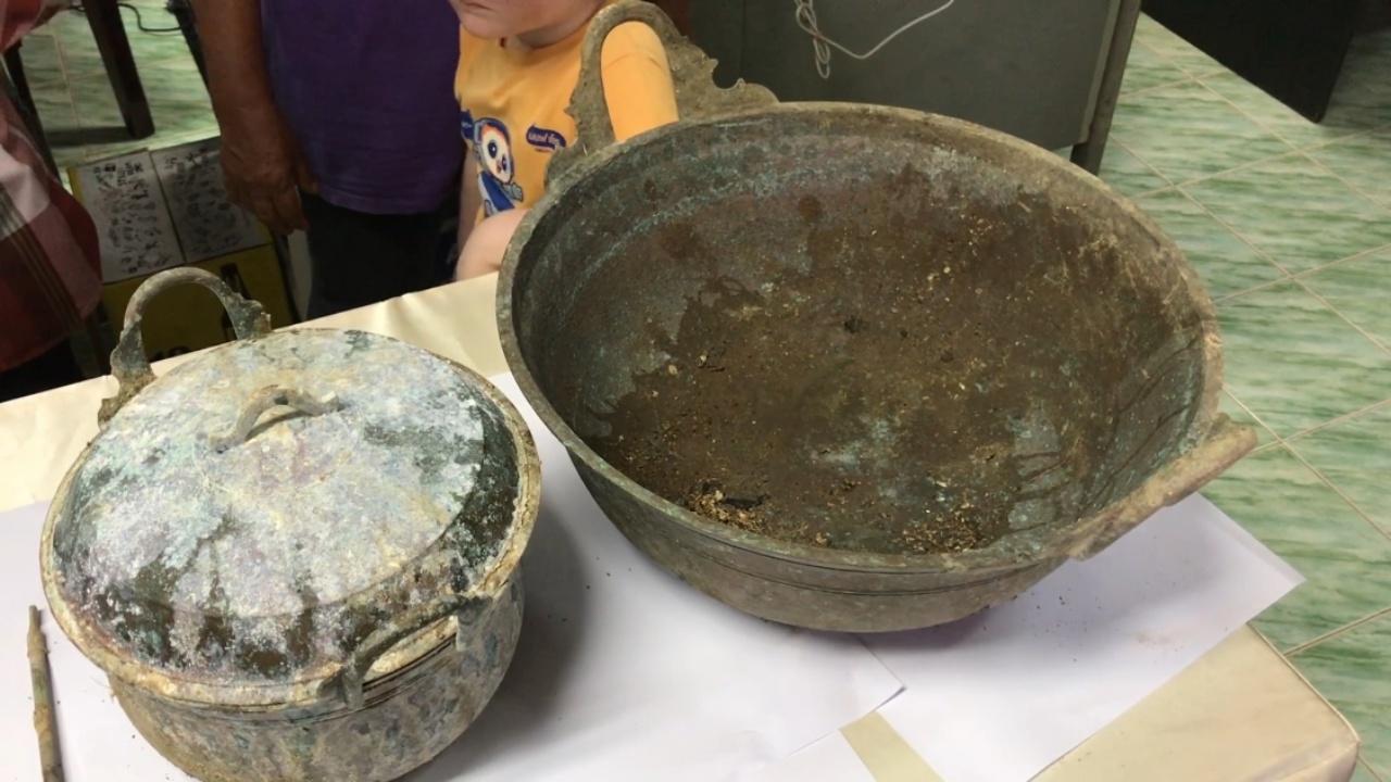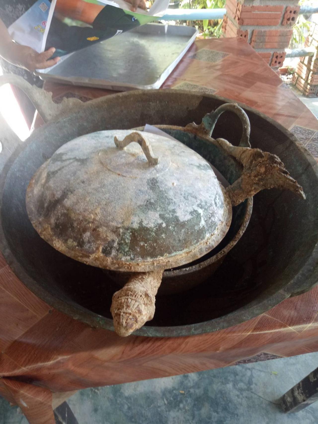 จากการตรวจสอบเบื้องต้น พบว่าวัตถุที่ทำการค้นพบ มีภาชนะหม้อทำจากทองเหลือง มีฝาปิด จำนวน 1 ใบ กระทะทองเหลืองขนาดใหญ่ 1 ใบ ไปป์สำหรับสูบบุหรี่ 2 อัน มีดกริชพร้อมปลอก 1 เล่ม มีดทองเหลืองพร้อมปลอก 1 เล่ม เหล็กทองเหลืองลักษณะคล้ายขวาน 1 เล่ม และก้อนประหลาดอีก 1 ก้อน ซึ่งชาวบ้านเรียกว่า เพชร 7 สี ซึ่งในขณะทำการขุดพบวัตถุทั้งหมดถูกกระทะทองเหลืองขนาดใหญ่ปิดทับอยู่ โดยสภาพทั่วไปถือว่าค่อนข้างจะสมบูรณ์เป็นอย่างมาก