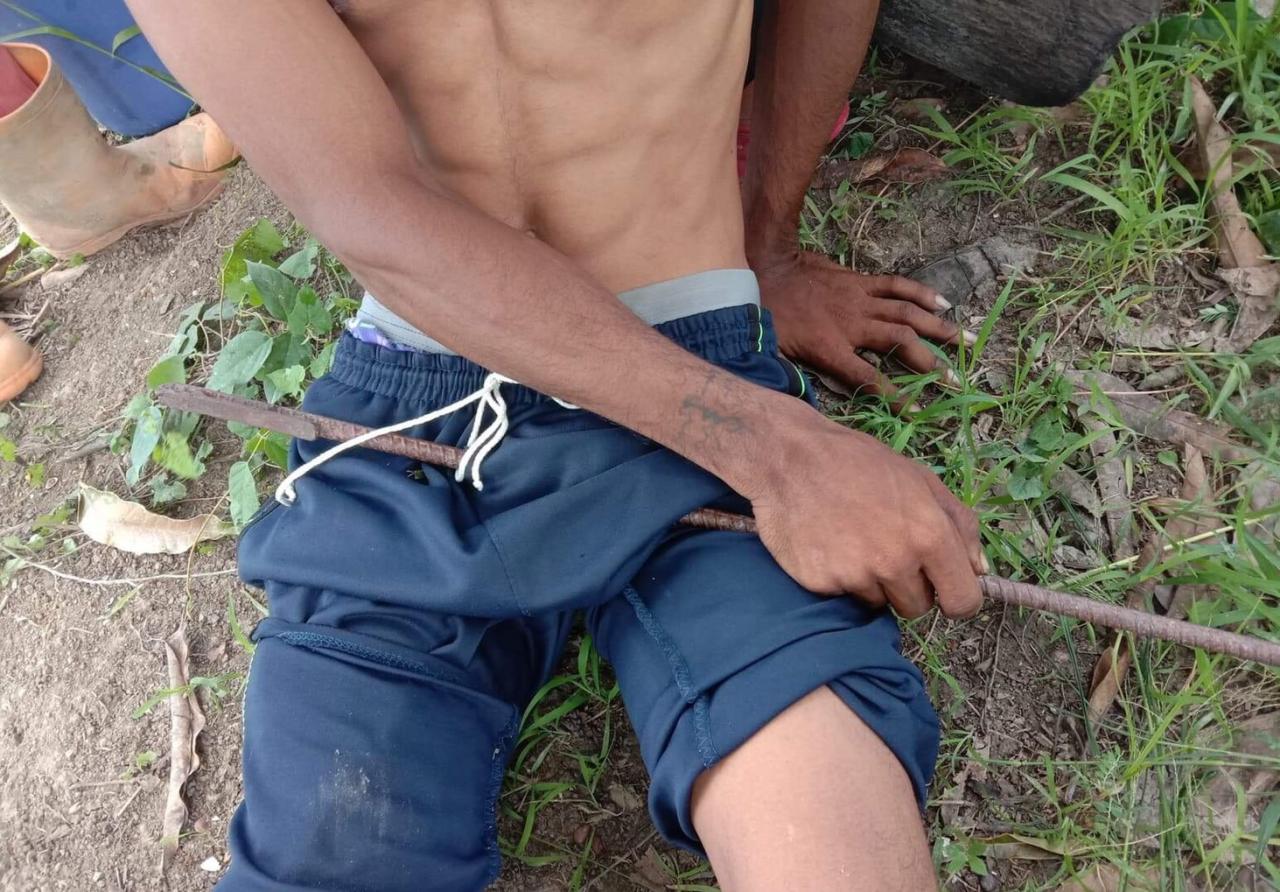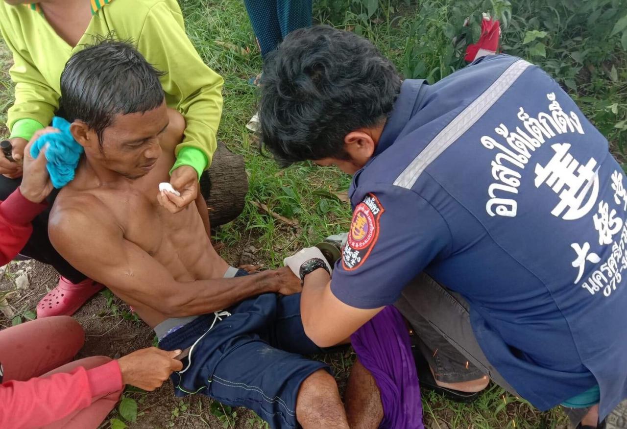 หนุ่มเมืองคอนพร้อมญาติเก็บพริกขี้หนูในไร่ ก่อนปีนต้นมะม่วงเพื่อเก็บผลมากิน แต่พลาด กิ่งมะม่วงที่เหยียบหัก ร่วงตกลงโดนเหล็กฐานผูกร่มเสียบโคนขาขวาทะลุพวงอวัยวะเพศ ปลายเหล็กทะลุไปโผล่โคนขาซ้าย ร้องด้วยความเจ็บปวด กู้ภัยเร่งตัดเหล็กที่เสียบคาอยู่ แต่ท่อนเหล็ก 1 ฟุต ยังติดคาพวงสวรรค์ จึงต้องเร่งนำตัวส่ง รพ.