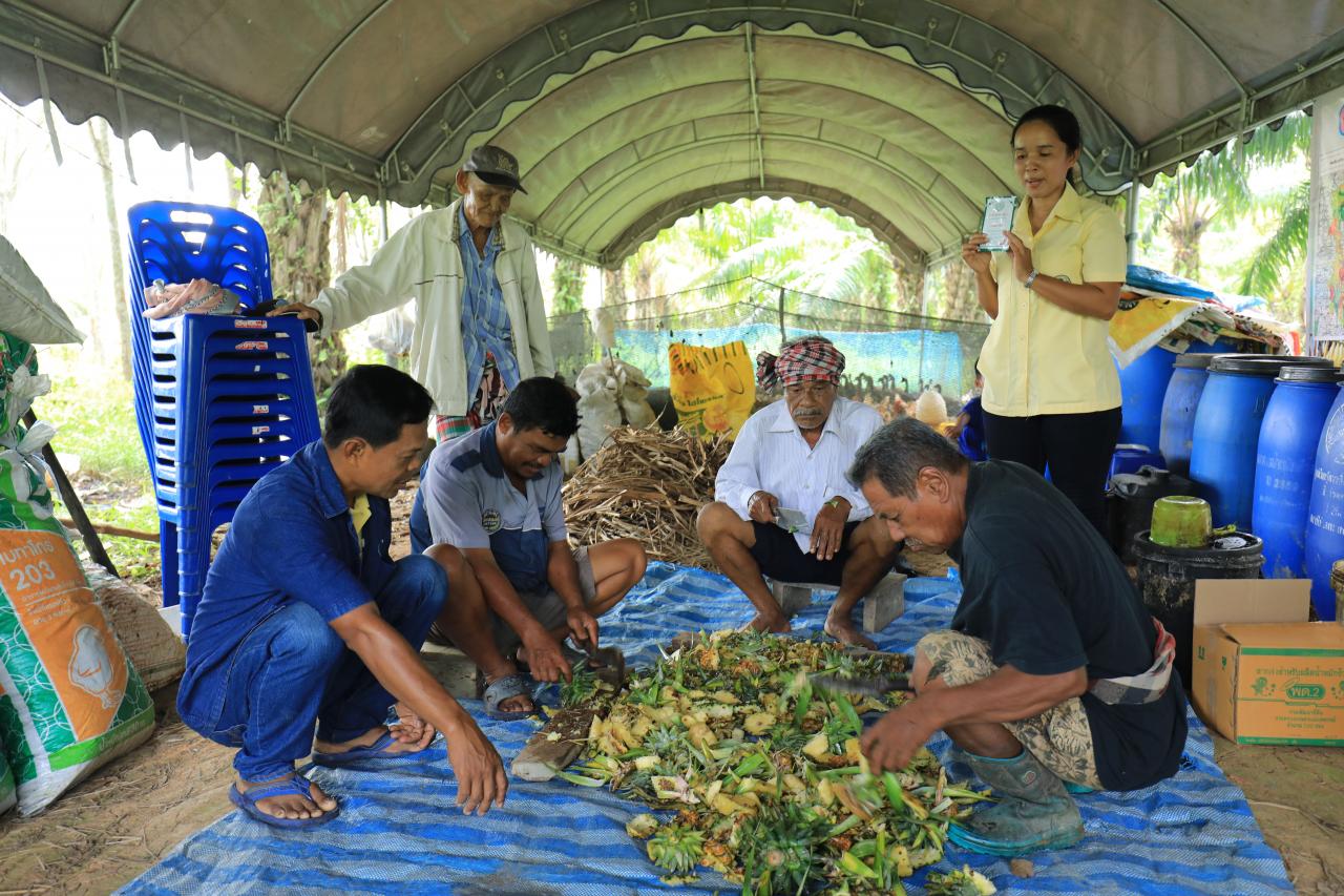 นางสาวนภา มาลัยสนั่น นักวิชาการเกษตรปฏิบัติการ สถานีพัฒนาที่ดินตรัง กล่าวว่า โดยปกติที่นี่เกษตรกรมีการทำการเกษตรคือทำนาอยู่แล้ว รวมทั้งเป็นศูนย์เรียนรู้การเพิ่มประสิทธิภาพการผลิตสินค้าเกษตร (ศพก.) และเป็นนาแปลงใหญ่ด้วย การที่ทางกรมพัฒนาที่ดินเข้ามาส่งเสริม เนื่องจากเล็งเห็นถึงความสำคัญของเกษตรกรซึ่งมีความตั้งใจแน่วแน่ที่จะลดต้นทุนการผลิต แต่ในพื้นที่ของเกษตรกรหมู่บ้านนาข้าวเสีย ดินยังขาดปริมาณอินทรีย์วัตถุ สถานีพัฒนาที่ดินตรัง จึงได้เข้ามาแนะนำให้เกษตรกรนำวัสดุเหลือใช้ในท้องถิ่นมาใช้ให้เกิดประโยชน์สูงสุด โดยทำปุ๋ยหมักและน้ำหมักชีวภาพ ก็เป็นการลดต้นทุนในระดับหนึ่ง เช่น ในส่วนของน้ำหมักก็จะมีทั้งสูตรผัก สูตรปลาและผลไม้ ตัวเกษตรกรเองจะไปขอเศษผักผลไม้และปลาต่างๆ จากตลาดโดยไปคุยกับพ่อค้าแม่ค้าให้เก็บไว้ให้ เพื่อนำมาทำน้ำหมักไว้ใช้ แต่ตัวปุ๋ยหมักจะใช้พวกฟางข้าวทะลายปาล์ม และมูลไก่แก่ เพราะบางพื้นที่มีการเลี้ยงไก่ มูลหมู เราเข้ามาส่งเสริมจนขณะนี้สามารถทำให้เกษตรกรลดต้นทุนได้ประมาณ 10 - 15 เปอร์เซ็นต์ ซึ่งถือว่าเป็นผลดีต่อเกษตรกรอย่างมาก