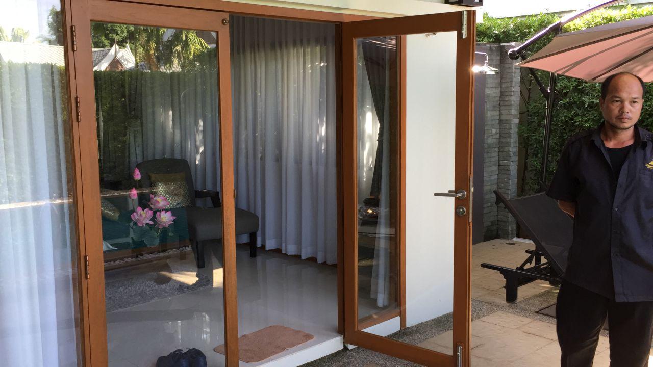 ที่เกิดเหตุภายในห้องพัก ชั้น 6 ที่เป็นห้องพักหรู มีสระว่ายน้ำส่วนตัว พบศพนายคริสโตเฟอร์ เฟาสต์ อายุ 40 ปี สัญชาติเยอรมัน สภาพศพนอนเสียชีวิตอยู่บนที่นอน สวมกางเกงขาสั้น สวมเสื้อยืดแขนยาว ที่ศีรษะถูกคลุมด้วยถุงพลาสติกสีเขียว มีเทปกาวพลาสติกสีแดง พันรอบคอขึ้นไปจนถึงบริเวณจมูก โดยม้วนเทปกาวยังคาอยู่ ตามตัวไม่พบบาดแผล สภาพศพคาดว่าเสียชีวิตมาแล้วประมาณ 1-2 วัน ตรวจสอบในห้องพัก พบข้าวของเครื่องใช้ของผู้ตายยังอยู่ครบ ทั้งคอมพิวเตอร์โน้ตบุ๊ก เงินสด บัตรเครดิต พาสปอร์ต นอกจากนี้ยังพบแก้วน้ำ 2 ใบ รินน้ำไว้ครึ่งแก้ว วางอยู่บนโต๊ะห่างจากเตียงประมาณ 2 เมตร หน้าห้องน้ำยังพบถุงพลาสติกลักษณะเดียวกันตกอยู่ 1 ใบ