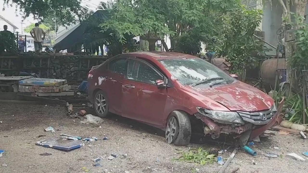 เกิดเหตุรถเก๋งฮอนด้า ซิตี้เสียหลักพุ่งชนศาลพระภูมิแตกหัก กระจัดกระจาย รวมทั้งชนเต็นท์แม่ค้าขายกุ้งพังเสียหาย ยายวัย 67 นอนอยู่ดีๆ ลุกหนีแทบไม่ทัน เชื่อเหรียญในหลวง ร.9 เนื้อทองแดง ช่วยแคล้วคลาดปลอดภัย