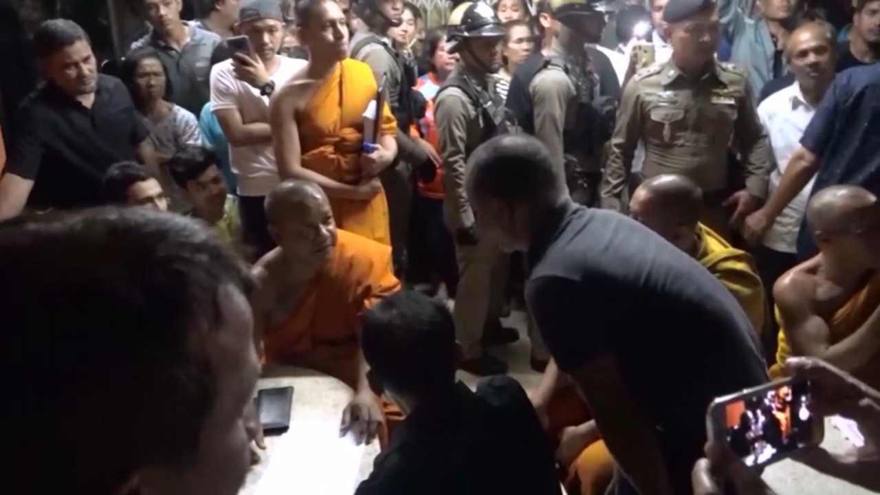 ขณะเดียวกัน ชาวบ้านอีกกลุ่มได้เข้าไปนำพระมหาเอกชัย เจ้าอาวาส ซึ่งนั่งสวดมนต์อยู่ในศาลาการเปรียญ พร้อมกับตะโกนขับไล่เจ้าอาวาสให้ออกจากวัด ก่อนที่เจ้าหน้าที่ตำรวจจะนำเจ้าอาวาสเข้าไปนั่งในรถ เนื่องจากเกรงว่าจะได้รับอันตรายจากชาวบ้าน กระทั่งพระครูสังฆรักษ์ เจ้าคณะตำบลพะวง พร้อมด้วย พ.ต.อ.จำลอง สุวลักษณ์ ผกก.สภ.เมืองสงขลา ได้เดินทางมาถึงพร้อมกับเจ้าหน้าที่ตำรวจ อส. เพื่อรักษาความสงบเรียบร้อย