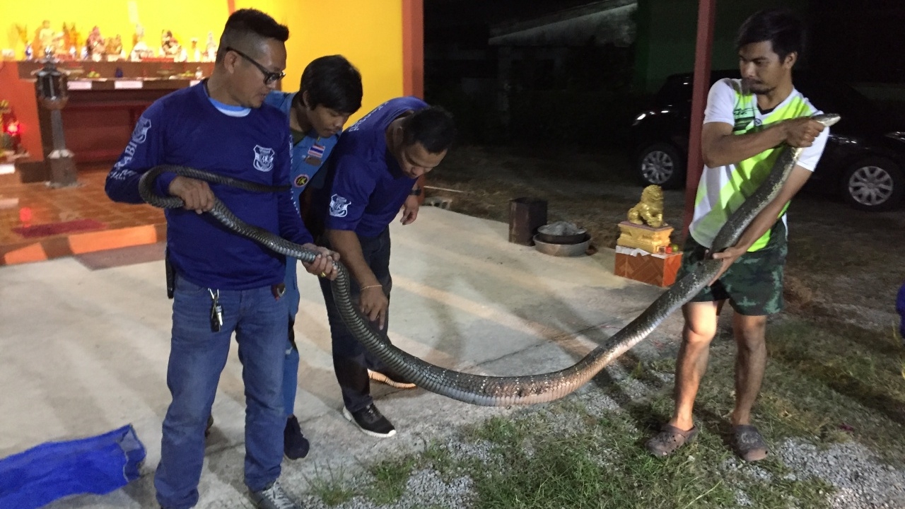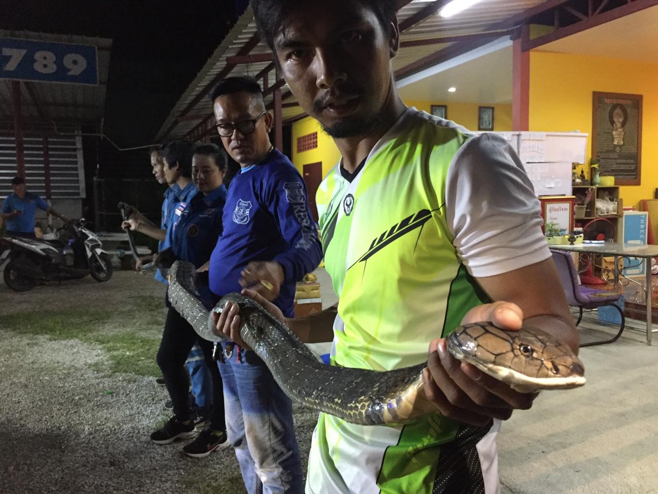 จนท.ต้องใช้เชือกผูกกับปลายท่อพีวีซีคล้องคองูไว้ ก่อนจะจับตัวไว้ได้ พบเป็นงูจงอางเพศผู้ ยาว 5 เมตร หนักประมาณ 13 กก. คาดว่ามีอายุประมาณ 8 ปี จนท.นำงูใส่กระสอบเตรียมนำไปปล่อยคืนสู่ป่า