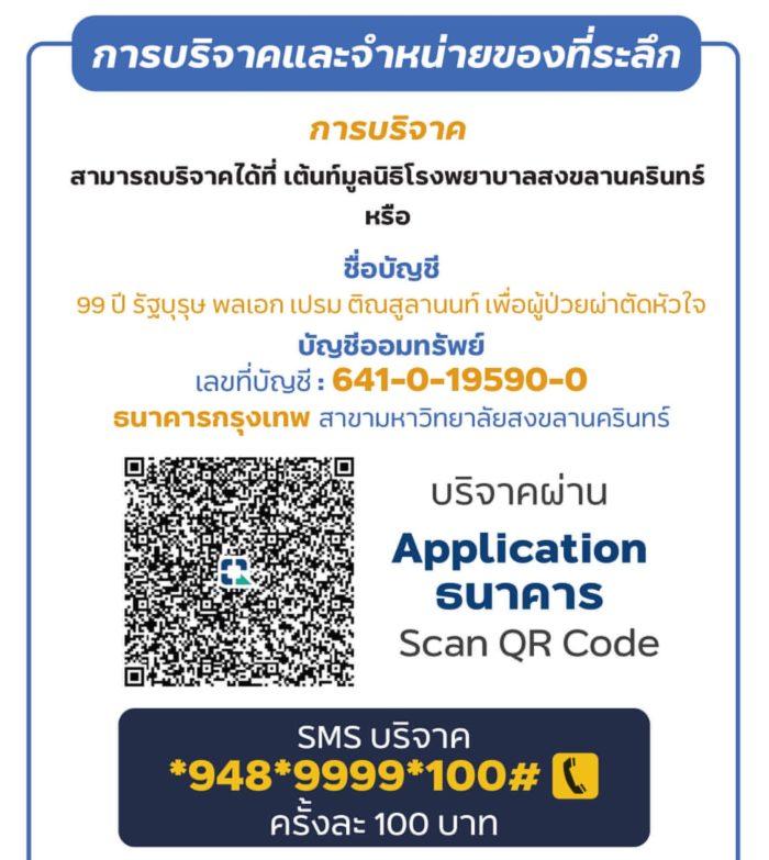 สามารถบริจาคเงินสมทบทุนร่วมโครงการสร้างโรงพยาบาลโรคหัวใจ รองรับผู้ป่วย 14 จังหวัดภาคใต้ ได้ที่บัญชี 99 ปี รัฐบุรุษ พลเอกเปรม ติณสูลานนท์ เพื่อผู้ป่วยผ่าตัดหัวใจ บัญชีออมทรัพย์เลขที่ : 641-0-19590-0 ธนาคารกรุงเทพ สาขามหาวิทยาลัยสงขลานครินทร์ หรือบริจาคผ่านช่องทาง SMS *948*9999*100# DTAC, TRUE, TOT, CAT ติดตามกิจกรรมต่างๆ ได้ที่เฟซบุ๊กแฟนเพจ : ๙๙ ปี ล้านความดี เพื่อรัฐบุรุษ พลเอก เปรม ติณสูลานนท์ หรือสอบถามรายละเอียดเพิ่มเติมที่ มูลนิธิโรงพยาบาลสงขลานครินทร์ โทร. 0-7445-1599.