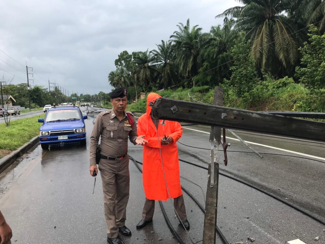 ขณะที่บนถนนเพชรเกษมฝั่งขาออกจาก จ.กระบี่ ช่วงบ้านเหนือ หมู่ 1 ต.คลองท่อมใต้ อ.คลองท่อม รับแจ้งมีลมกระโชกแรง พัดเสาไฟฟ้าล้มขวางถนนกว่า 10 ต้น โดยสายไฟหล่นลงมาทับรถกระบะ ยี่ห้อนิสสัน สีดำ ทะเบียน กต 429 กระบี่ ได้รับความเสียหาย 1 คัน นายวุฒิชัย ธรรมศิริ ผจก.การไฟฟ้าส่วนภูมิภาคกระบี่ นำ จนท.เข้าไปตรวจสอบพร้อมปิดเส้นทางการจราจรฝั่งขาออก เป็นระยะทาง 500 เมตร โดยระบายรถให้วิ่งในเลนฝั่งขาเข้าแทน จนท.การไฟฟ้าส่วนภูมิภาคกระบี่ ต้องเร่งเคลียร์เส้นทาง