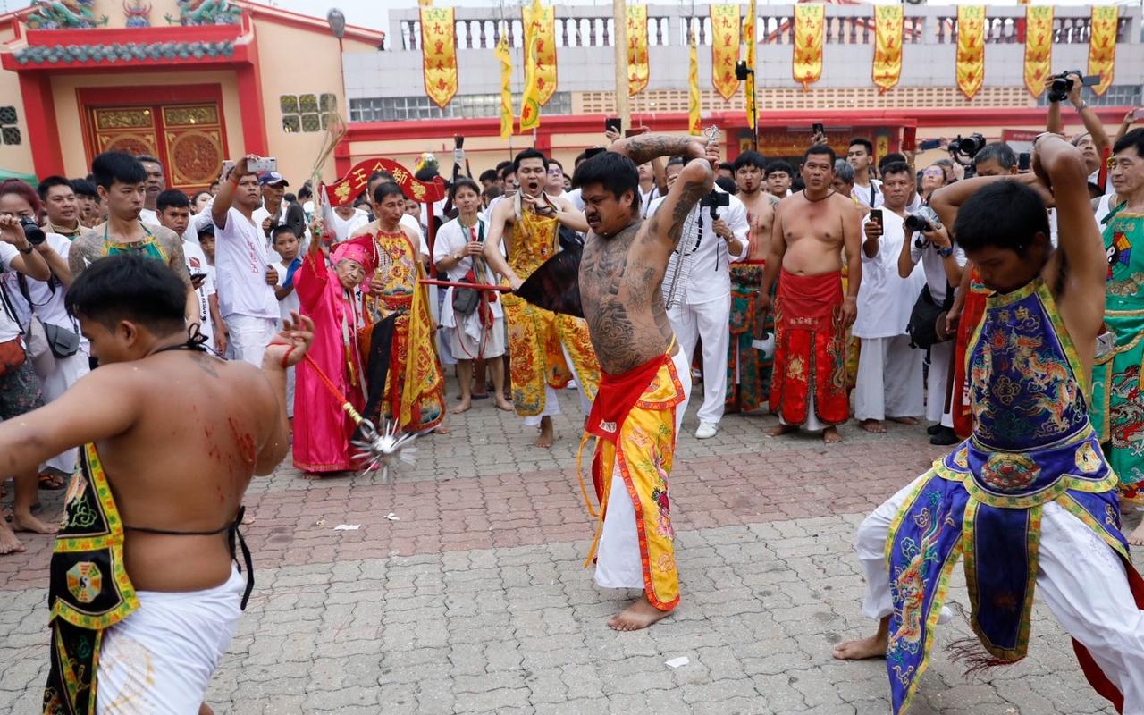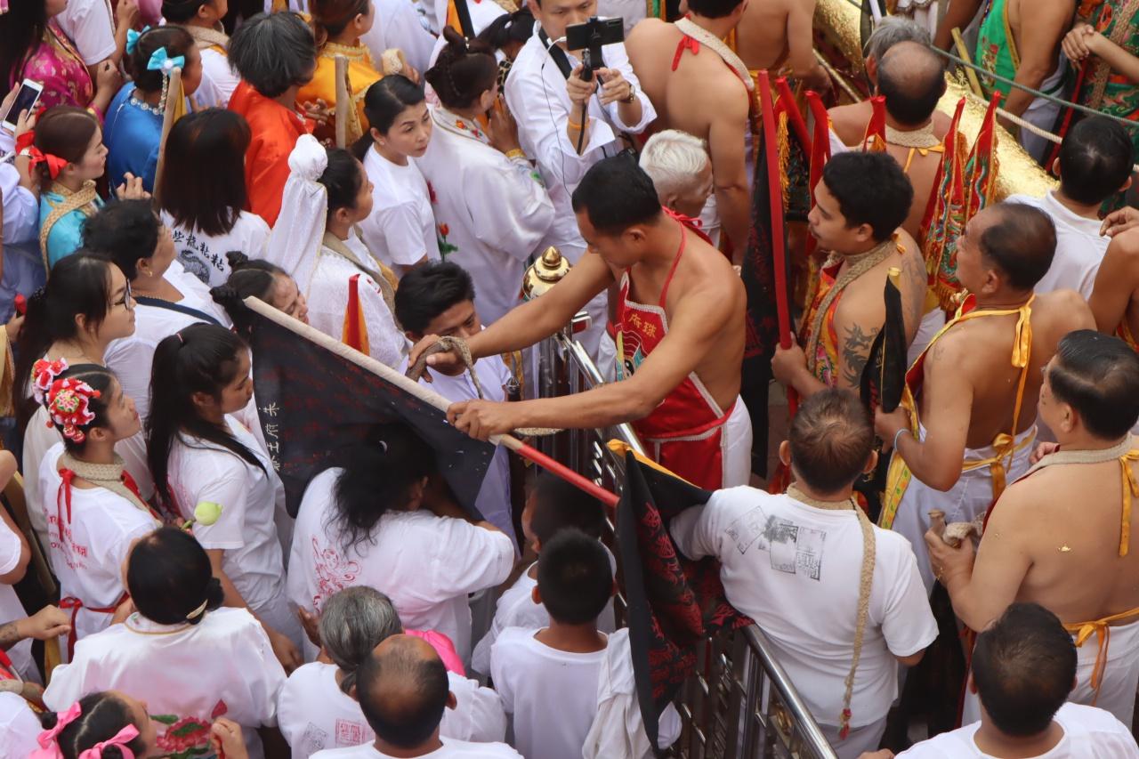 จากนั้นมีการอัญเชิญเหนี่ยวสั่ว (ร่มฉัตรจีน) และตะเกียงทั้ง 9 ดวงออกจากศาลเจ้า เพื่อนำไปผูกยึดกับปลายไม้ไผ่ ก่อนร่วมดึงขึ้นสู่ยอดเสา จากนั้นเหล่าม้าทรงที่มีองค์เทพต่างๆ ประทับอยู่ในร่างได้ใช้อาวุธทิ่มแทงและฟันไปตามร่างกาย เพื่อแสดงอิทธิฤทธิ์อย่างน่าหวาดเสียว