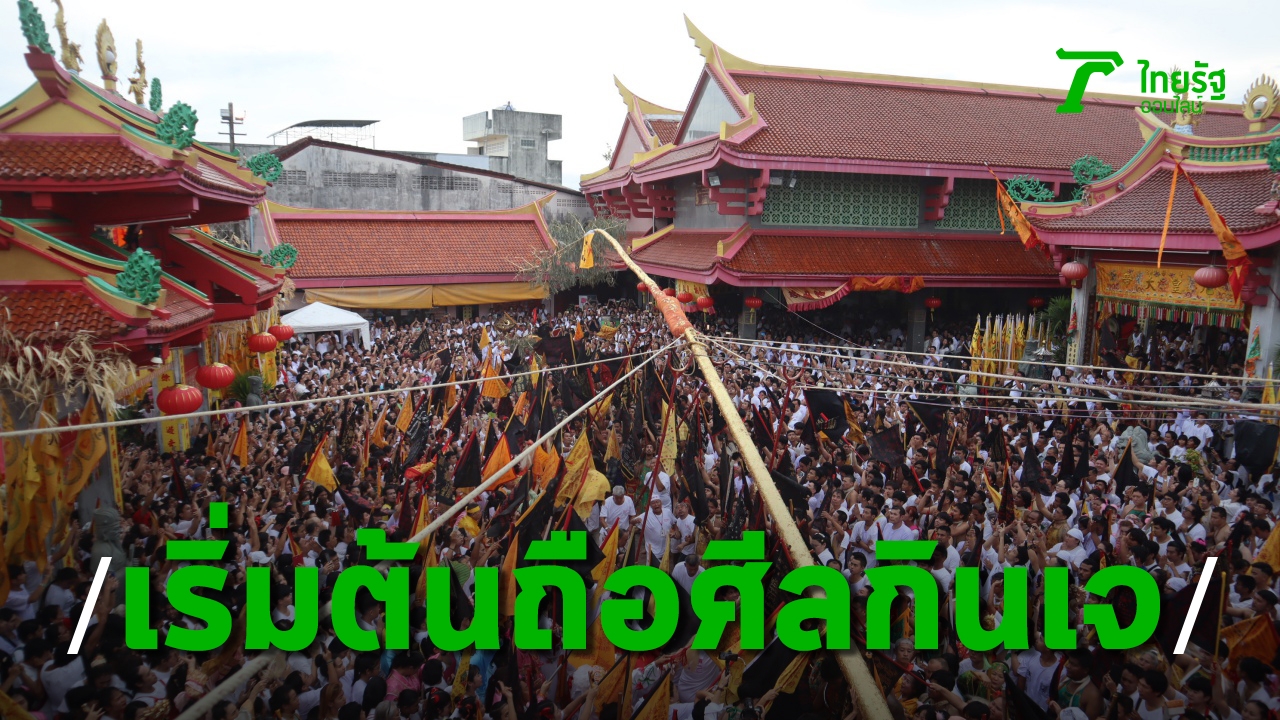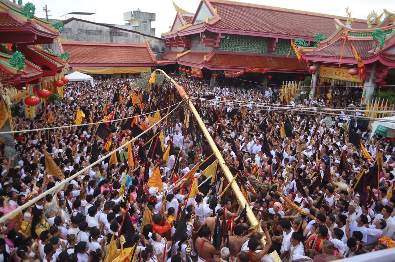ฤกษ์งามยามดี เสียงปี่กลองดังสนั่น ชาวภูเก็ตนับพันคน ร่วมยกเสาโกเต้งศาลเจ้าจุ้ยตุ่ยเต้าโบ้เก้ง สัญลักษณ์เริ่มต้นประเพณีถือศีลกินผักประจำปี เหล่าม้าทรง แสดงอิทธิฤทธิ์น่าหวาดเสียว