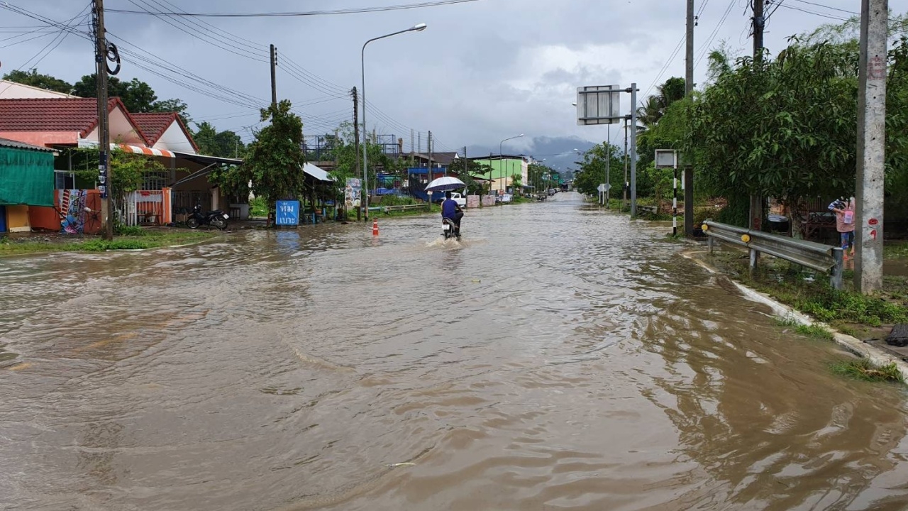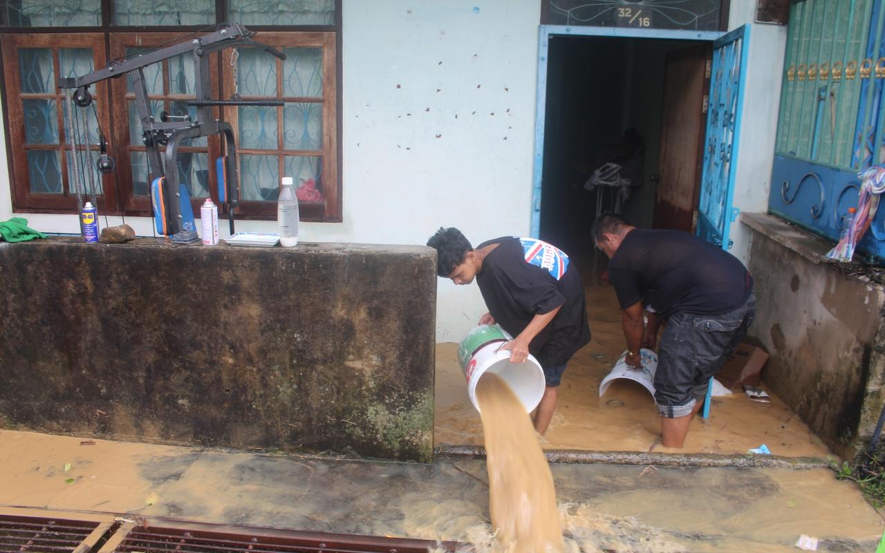 ฝนถล่มเบตง 1 ชม. น้ำระบายไม่ทัน เศษขยะกิ่งไม้ไหลมากับน้ำ เข้าท่วมถนน-บ้านเรือน รวมถึงบ้านพักตำรวจ ตชด.445 เสียหายเกือบ 30 หลัง หลังน้ำลดพบว่าเต็มไปด้วยดินโคลน ต้องฉีดน้ำล้างออก