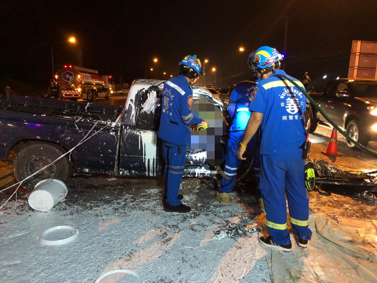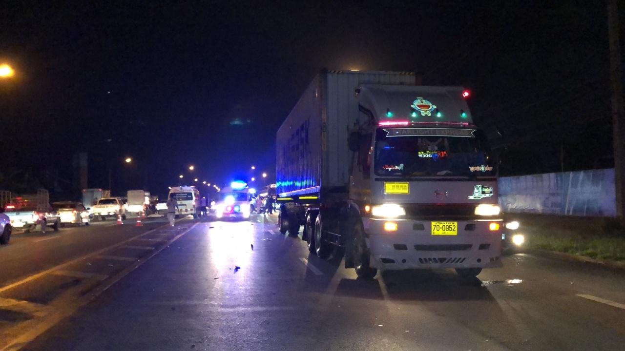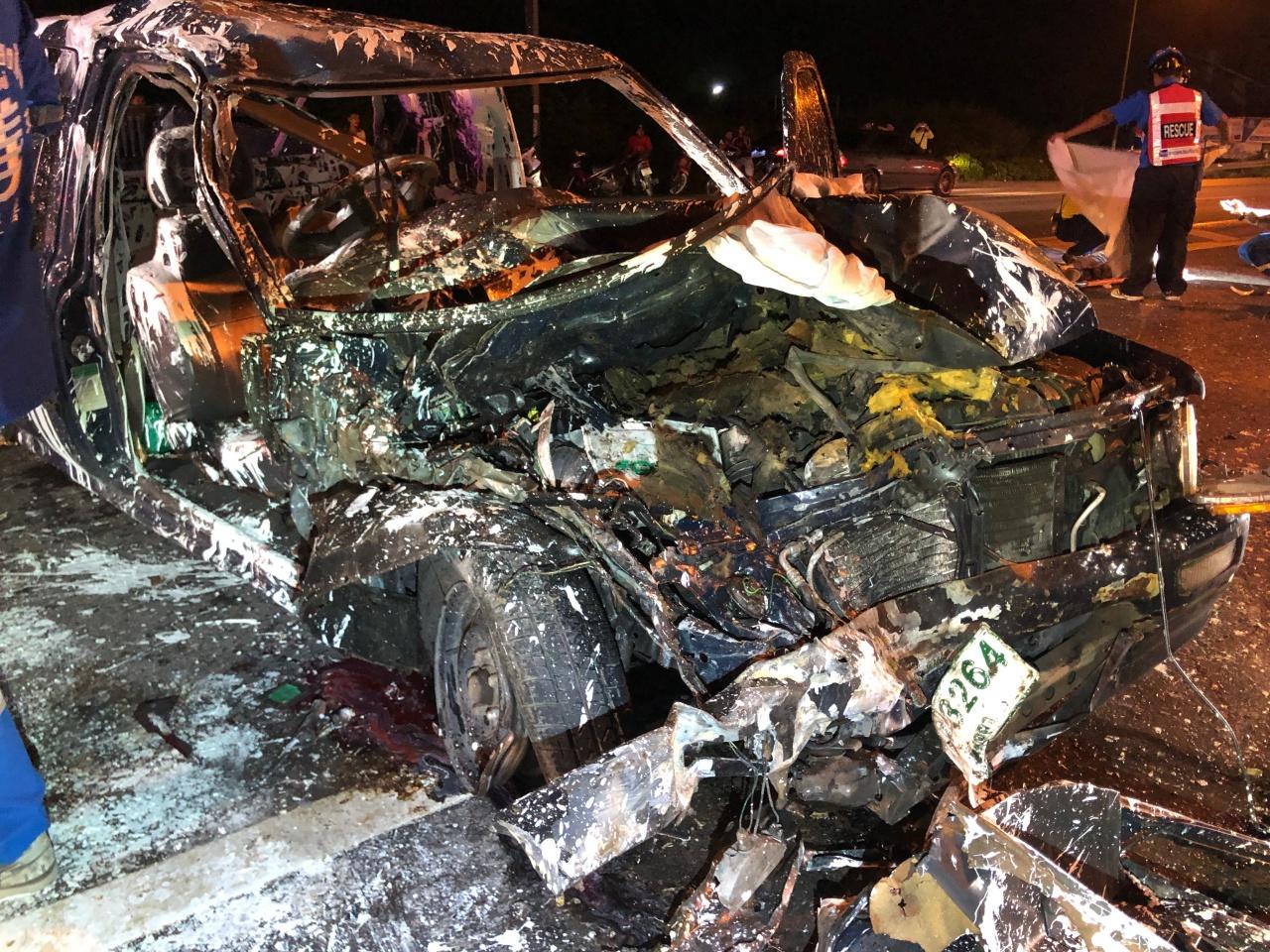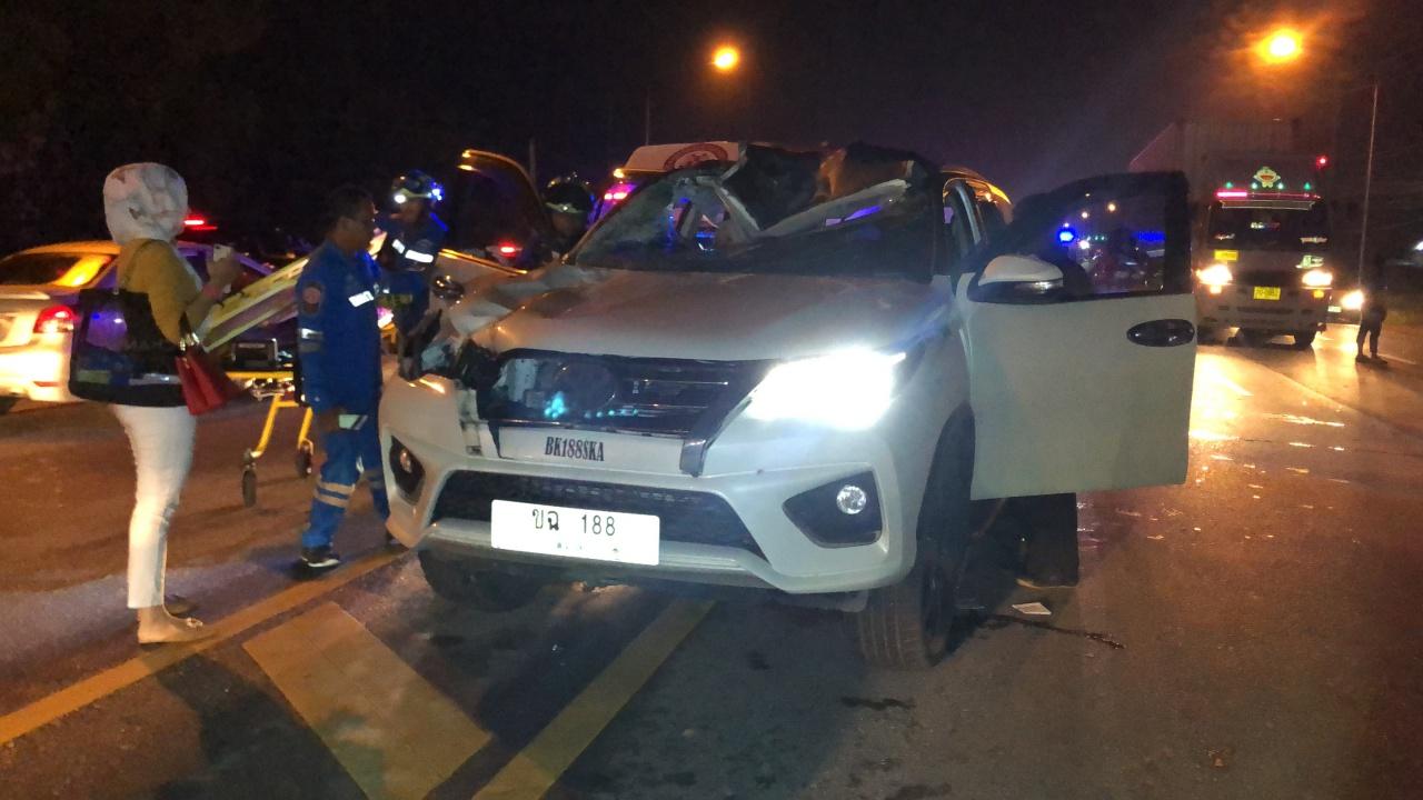 ในจุดเกิดเหตุพบว่ารถที่ประสบเหตุเริ่มมาจากรถกระบะหมายเลขทะเบียน บต 3264 สงขลา ซึ่งบรรทุกสีทาบ้านมาบนกระบะท้าย ได้ชนท้ายรถจักรยานยนต์ที่จอดอยู่กลางถนนเตรียมเลี้ยวเข้าซอย และเสียหลักพุ่งไปชนรถโตโยต้า ฟอร์จูนเนอร์ ที่วิ่งสวนมาและไถลไปชนท้ายรถพ่วงที่สวนมาอีกคันสภาพรถกระบะด้านหน้าพังเสียหายสีแตกกระจายบนถนน และมีผู้เสียชีวิตอยู่ภายในรถ 2 คน คือ นายสมชาติ หนูยัง อายุ 47 ปี คนขับ และนาย ZAY YAR AUNG อายุ 21 ปี แรงงานชาวเมียนมาที่เป็นลูกน้อง