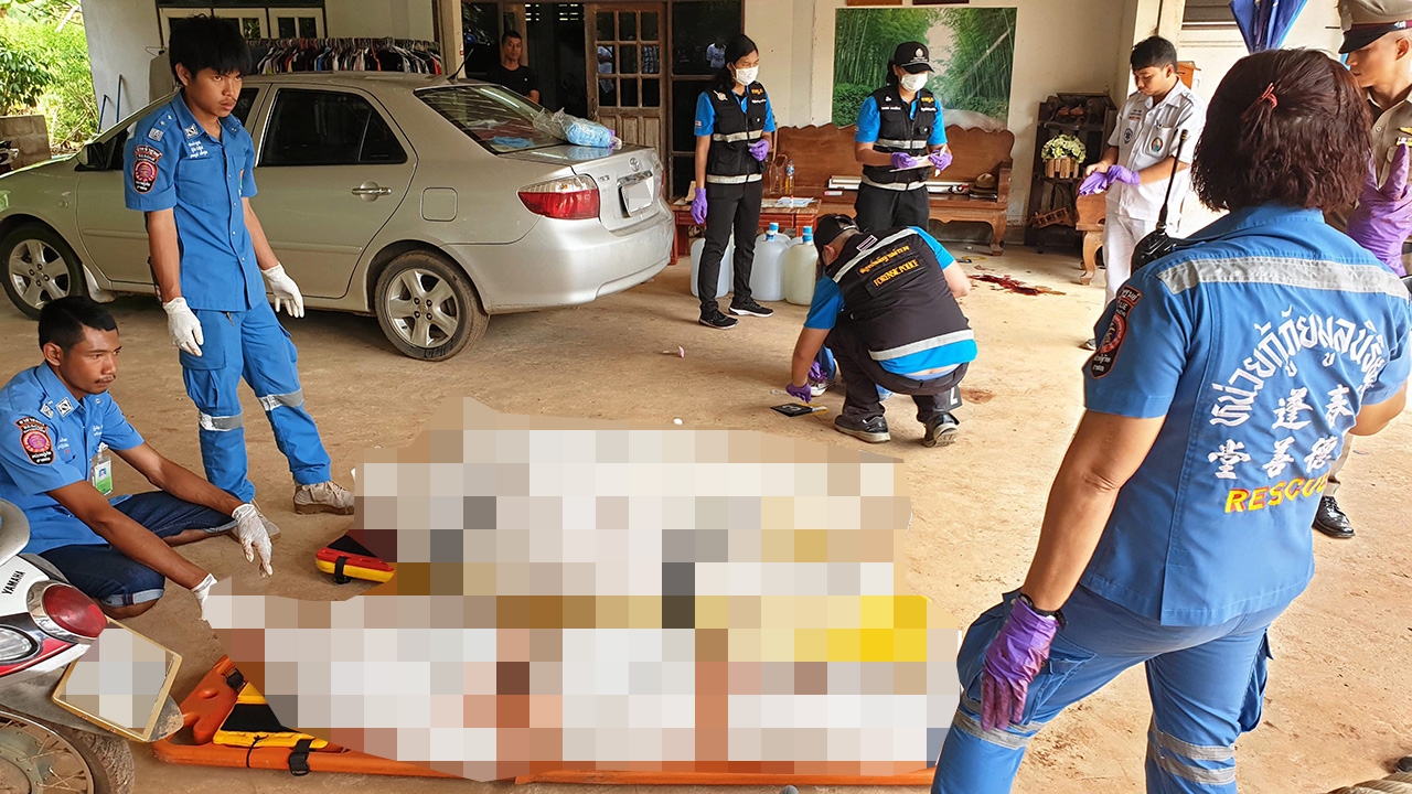 จนท.กู้ภัยเก็บศพนางจินดา ทองพรหม นางพรทิพย์ ทองพรหม ลูกสาว และ ด.ญ.นัยปพร ภูวิชิต หลานสาววัย 13 ปี ถูกนายสุนันท์ รามดร อดีตกำนันบุกยิง 3 ศพ ที่บ้านเลขที่ 9/2 หมู่ 7 ต.ขุนกระทิง อ.เมืองชุมพร หลังก่อเหตุเข้ามอบตัวอ้างปมแค้นถูกเบี้ยวหนี้กว่า 8 ล้านบาท.