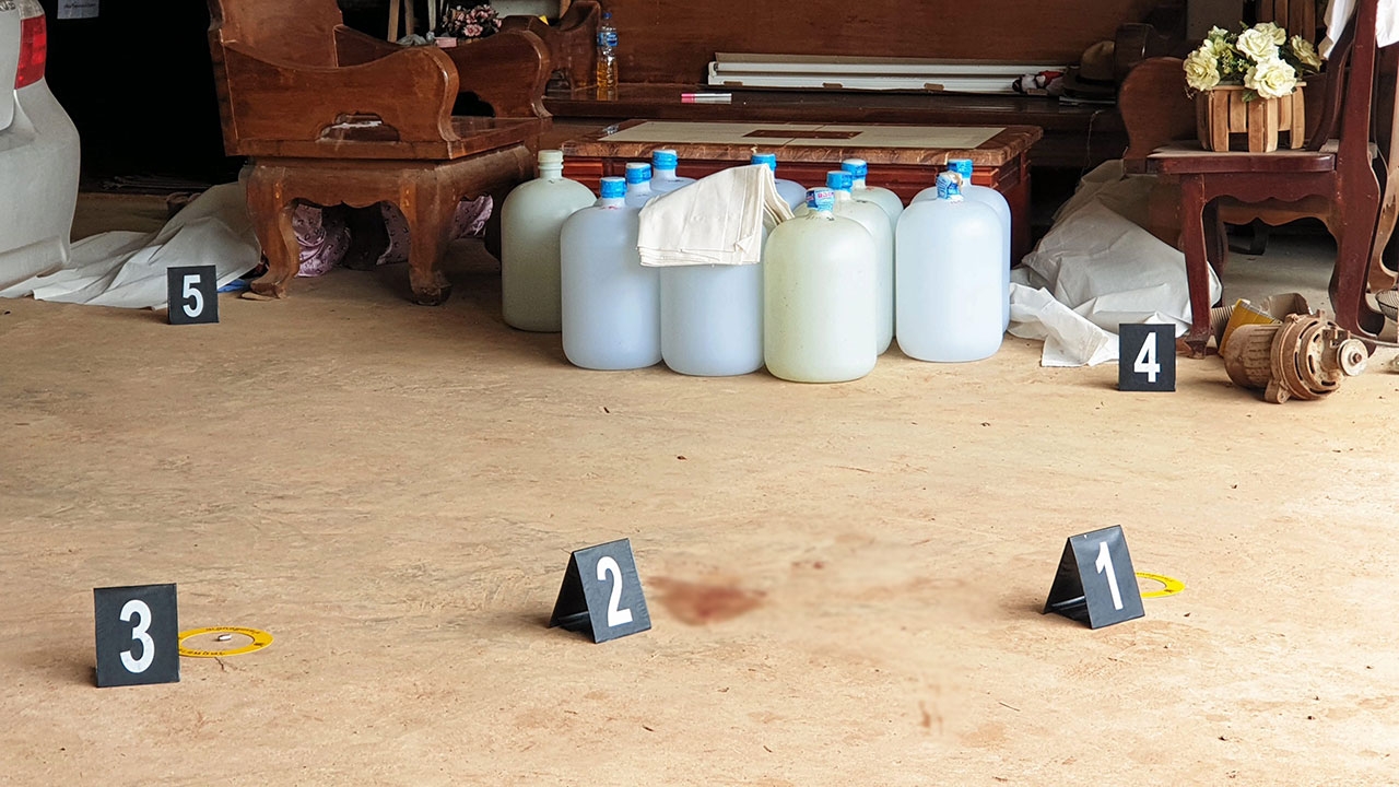 ที่เกิดเหตุเป็นบ้านปูนชั้นเดียวหลังใหญ่ บริเวณโดยรอบเป็นสวนทุเรียนและกล้วยหอมทองรวมพื้นที่กว่า 15 ไร่ ที่โรงจอดรถหน้าบ้านมีรถเก๋ง โตโยต้าวีออส สีบรอนซ์ ทะเบียน กง 585 ชุมพร จอดอยู่ บริเวณโต๊ะรับแขกใกล้ประตูบ้านพบผู้เสียชีวิต 2 ศพนอนจมกองเลือดที่พื้นทราบชื่อนางจินดา ทองพรหม อายุ 61 ปี เจ้าของบ้าน ถูกยิงด้วยปืน 9 มม.ที่ใบหน้า 3 นัด ส่วนอีกศพอยู่ใกล้กันคือนางพรทิพย์ ทองพรหม อายุ 38 ปี ลูกสาวของนางจินดา ถูกยิงด้วยปืนขนาดเดียวกันที่ใบหน้า 2 นัด