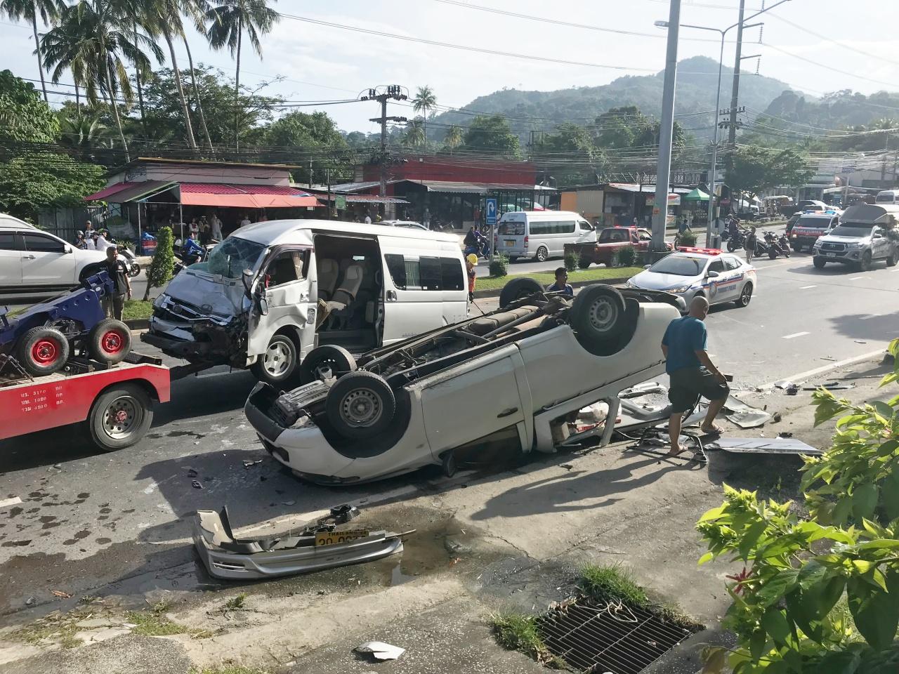 เมื่อเวลา 15.10 น. วันที่ 30 พ.ย. พ.ต.ท.สมชาย หนูบุญ รอง ผกก.สอบสวน สภ.กะทู้ จ.ภูเก็ต รับแจ้งอุบัติเหตุรถยนต์กระบะเสียหลักพุ่งข้ามเลนชนรถตู้ มีผู้บาดเจ็บรวม 6 ราย บริเวณทางลงเขาป่าตอง มุ่งหน้าแยกสี่กอ ใกล้ปั๊มน้ำมัน ปตท. ต.กะทู้ อ.กะทู้ จ.ภูเก็ต โดยที่เกิดเหตุมีรถติดยาว พบรถตู้ ทะเบียน 30-0279 นครศรีธรรมราช จอดอยู่กลางถนน สภาพด้านหน้าถูกชนยับเยิน มีนักท่องเที่ยวติดอยู่ภายใน เจ้าหน้าที่เร่งช่วยเหลือจำนวน 5 คน ทั้งหมดเป็นนักท่องเที่ยวชาวรัสเซีย บางคนหมดสติ บางรายศีรษะแตกเลือดอาบ ส่วนนายส่อผาน สะหารกริด อายุ 53 ปี คนขับรถตู้อัดก๊อบปี้คาพวงมาลัย เจ้าหน้าที่ได้ช่วยเหลือออกมาอย่างปลอดภัย