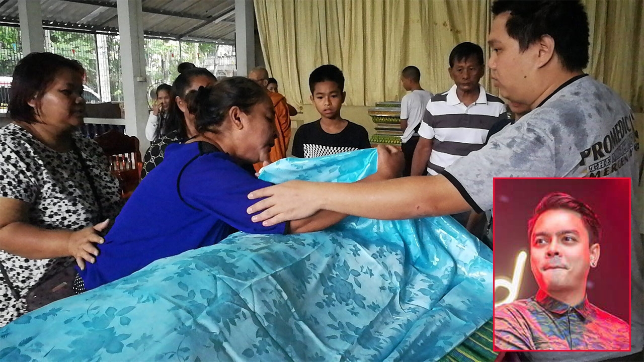 น.ส.พานีย์ เมืองจันทร์ ดึงผ้าแพรคลุมศพนายภูริวัฒน์ หรือคิว สุวรรณมณี (รูปเล็ก) ลูกชาย เป็นนักร้องนำวง Fridaynight to Sunday ตั้งศพสวดที่วัดท่าเคียน อ.หาดใหญ่ จ.สงขลา หลังป่วยเป็นโรคซึมเศร้า สุดทนใช้เชือกผูกคอตาย.