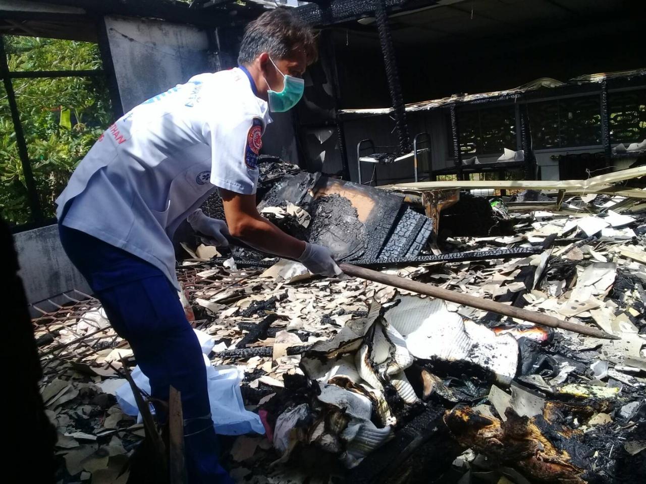 ที่เกิดเหตุเป็นบ้านปูนชั้นครึ่ง พบเปลวเพลิงกำลังลุกโชนอยู่บริเวณชั้นบนของบ้าน นักดับเพลิงเร่งใช้น้ำฉีดดับเพลิงใช้เวลาประมาณ 10 นาที สามารถควบคุมเพลิงไว้ได้ จากการตรวจสอบพบว่าในห้องดังกล่าวเป็นห้องพระถูกเพลิงไหม้ได้รับความเสียหายทั้งหมด นอกจากนี้ในที่เกิดเหตุพบผู้เสียชีวิต 1 รายทราบชื่อต่อมา นายชัยยุทธ ทิพยวรรณ อายุ 66 ปี ครูสอนวิชาฝรั่งเศส เกษียนราชการที่โรงเรียนสภาราชินี สภาพศพถูกไฟคลอกช่วงตัวตั้งแต่เข่าจนไหม้เกรียม จนท.กู้ภัยฯ ต้องช่วยกันนำศพออกมาอย่างทุลักทุเล ก่อนนำศพส่ง รพ.ศูนย์ตรัง เพื่อหาสาเหตุการเสียชีวิต
