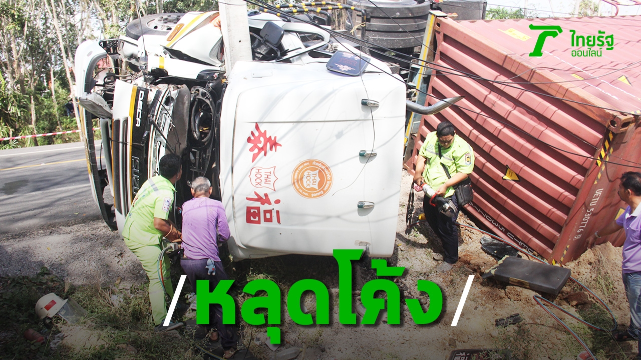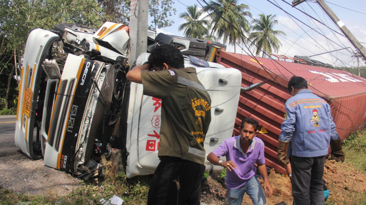 ที่เกิดเหตุพบรถเทรลเลอร์ 18 ล้อ ของ หจก.ไทฮก รับเบอร์ ทะเบียนส่วนหัว 71-3381 สงขลา และส่วนหาง 71-4680 สงขลา ที่บรรทุกตู้คอนเทนเนอร์สินค้าขนาดใหญ่มา 1 ตู้ เสียหลักชนเสาไฟฟ้าริมทางจนพลิกคว่ำขนานไปกับถนน และส่วนของหัวรถ โดยเฉพาะห้องโดยสารอัดคาอยู่กับเสาไฟฟ้าต้นที่ 2 จนทำให้คนขับ ซึ่งทราบชื่อในเวลาต่อมาคือ นายวิโรจน์ นวลศรี อายุ 34 ปี ชาว อ.เขาชัยสน จ.พัทลุง ถูกแรงอัดเสียชีวิตคาซากรถ นอกจากนี้ ยังมีน้ำมันรถรั่วไหลออกมาด้วย แต่โชคดีที่ไม่เกิดเป็นเพลิงลุกไหม้ตามมา