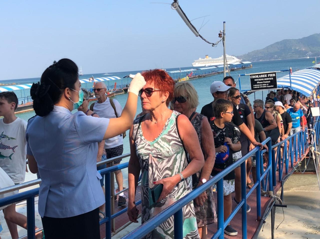 เมื่อช่วงบ่ายวันที่ 21 ก.พ.63 ที่บริเวณโป๊ะเทียบเรือชั่วคราว ชายหาดป่าตอง ต.ป่าตอง อ.กะทู้ จ.ภูเก็ต เป็นไปด้วยความคึกคักอีกครั้ง โดยเจ้าหน้าที่ศูนย์อำนวยการรักษาผลประโยชน์ทางทะเล หรือ ศรชล.ภาค 3 พร้อมด้วยทัพเรือภาคที่ 3 เจ้าหน้าที่ กอ.รมน.จ.ภูเก็ต เจ้าหน้าที่สาธารณสุขจังหวัด เจ้าหน้าที่โรงพยาบาลป่าตอง เจ้าท่าภูมิภาคที่ 5 สาขาภูเก็ต และเจ้าหน้าที่ที่เกี่ยวข้องตรวจคัดกรองผู้โดยสารจำนวน 2,150 คน และลูกเรือ 988 คนที่มากับเรือสำราญ ชื่อ COSTA FORTUNA สัญชาติอิตาลี ซึ่งเข้ามาจอดลอยลำบริเวณหน้าอ่าวป่าตอง เพื่อส่งและรับนักท่องเที่ยว ก่อนจะเดินทางออกจากภูเก็ตไปยังประเทศสิงคโปร์ในวันที่ 22 ก.พ.เวลา 18.00 น.