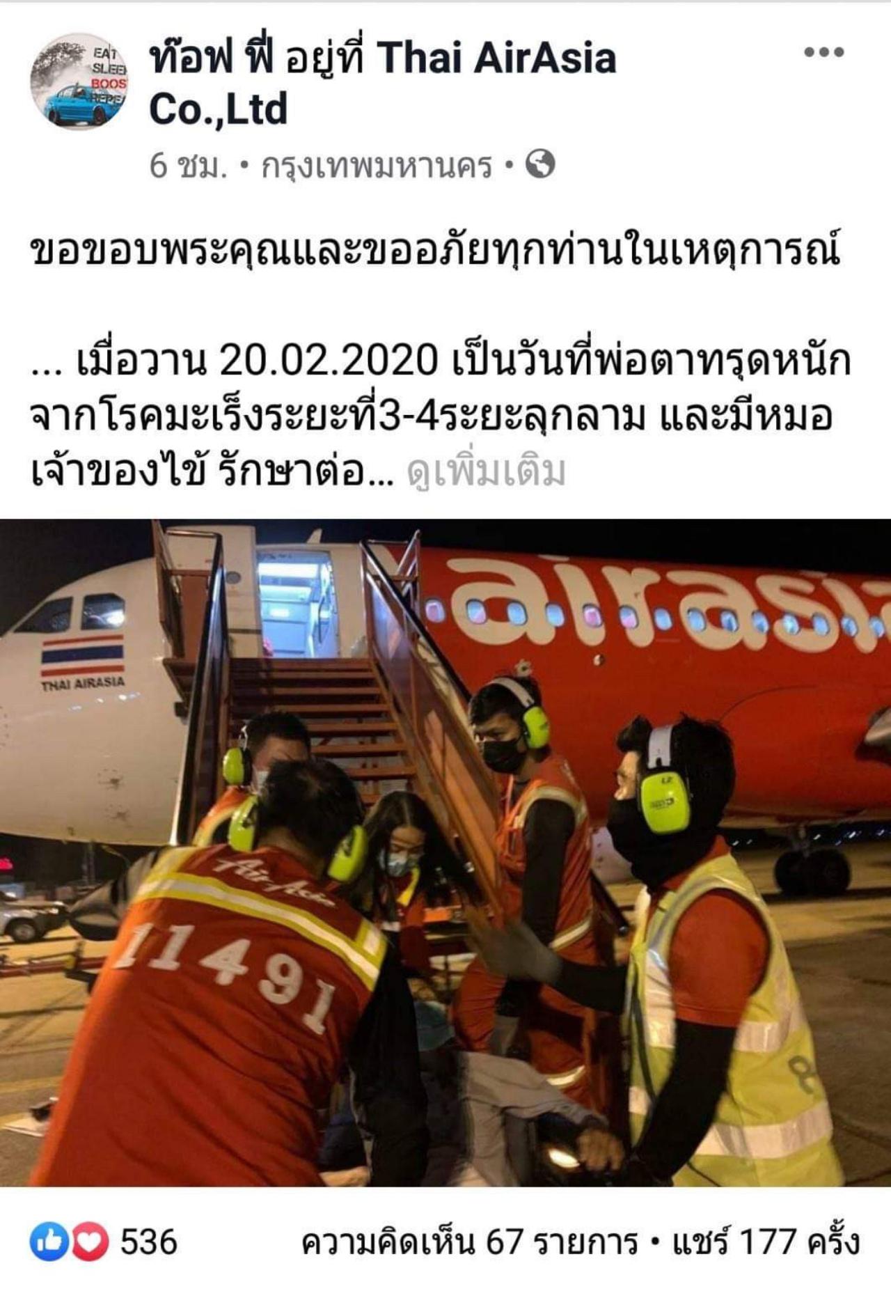 "ขอขอบพระคุณและขออภัยทุกท่านในเหตุการณ์ ... เมื่อวาน 20.02.2020 เป็นวันที่พ่อตาทรุดหนักจากโรคมะเร็งระยะที่ 3-4 ระยะลุกลาม และมีหมอเจ้าของไข้ รักษาต่อเนื่องมานานนับปี และให้ยาบำบัด ณ รพ.ศิริราช กทม. ปกติตามนัดคือต้องไปในวันที่ 02 มี.ค. 2020 แต่ด้วยอาการที่ทรุดลง ทำให้ต้องซื้อตั๋วเครื่องบินด่วน ไปทั้งครอบครัวรวม 4 คน โดยใช้บริการของสายการบิน "ไทยแอร์เอเชีย "เที่ยวบิน FD3234 URT - DMK 19.55 น. ในวันเดียวกัน