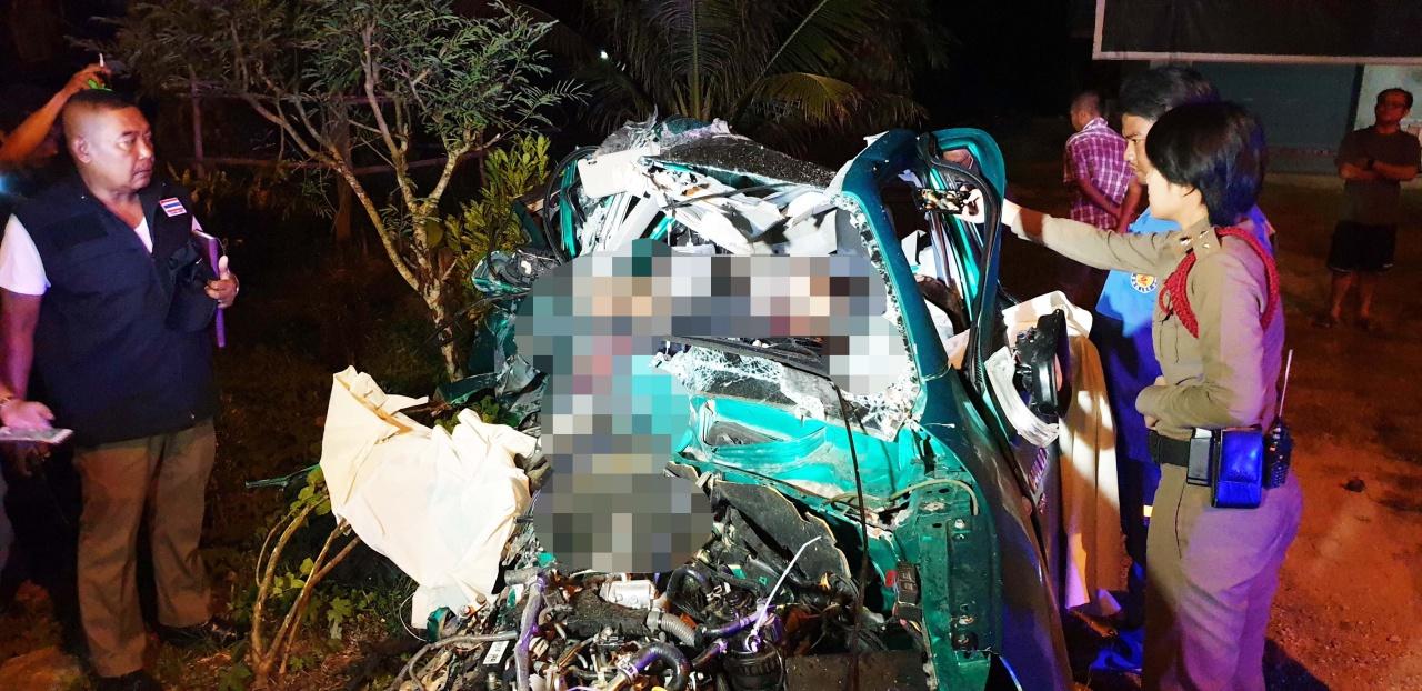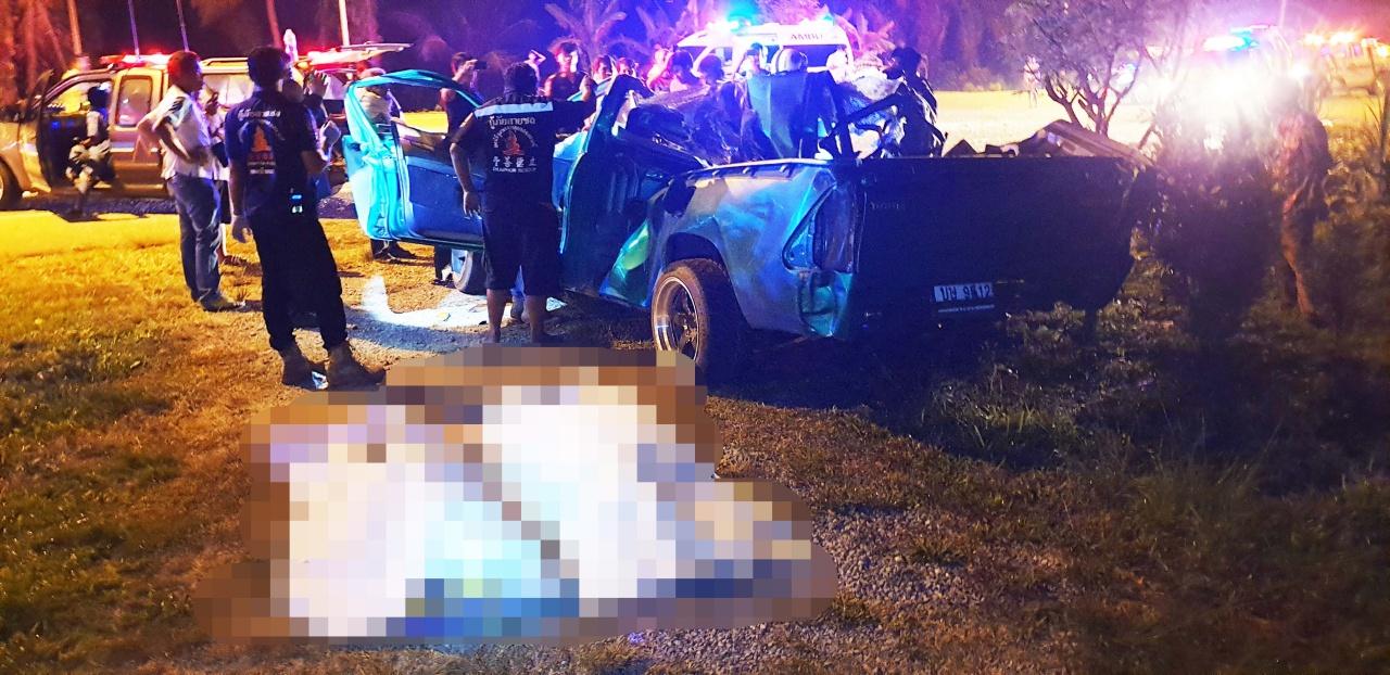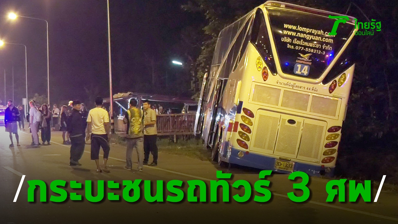 กระบะแหกโค้งประสานงากับรถทัวร์ท่องเที่ยวต่างชาติตรงโค้งอันตราย ถนนตัดใหม่สายศูนย์ราชการชุมพร-ท่าแซะ จนสภาพพังยับตายคาที่ 3 ศพ คนขับคู่กรณีบาดเจ็บ 1 ราย ตร.เมืองชุมพร เร่งสอบสาเหตุแล้ว