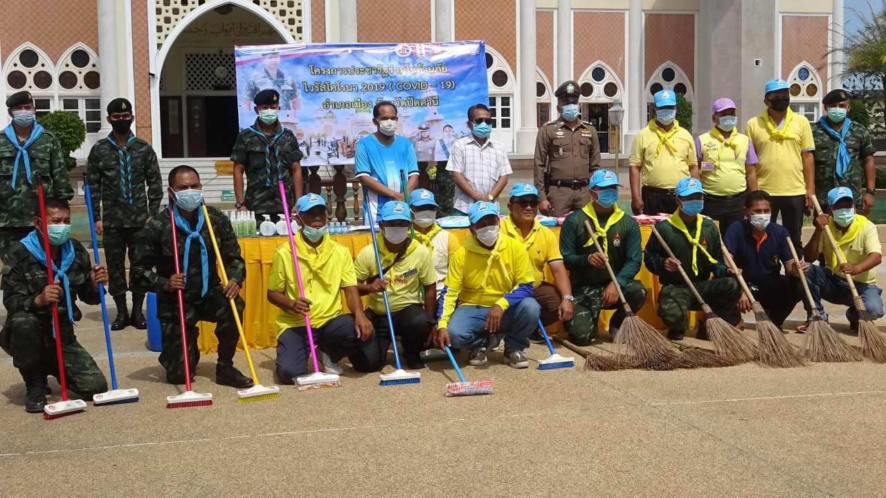 เวลา 10.00 น. วันที่ 23 มีนาคม ที่มัสยิดกลางจังหวัดปัตตานี พ.ท.ภาคภูมิ จันทรักษ์ ผู้บังคับหน่วยเฉพาะกิจปัตตานี 25 นำเจ้าหน้าที่ทหาร ตำรวจ เจ้าหน้าที่เทศบาลเมืองปัตตานี และประชาชนจิตอาสาในพื้นที่ จำนวน 300 คน ร่วมใจกันทำความสะอาดภายในและบริเวณโดยรอบมัสยิดกลางจังหวัดปัตตานี ตามโครงการ ประชารัฐร่วมใจต้านภัยไวรัสโคโรนา 2019 เพื่อเป็นการป้องกันและทำลายเชื้อโควิด-19 ที่กำลังระบาดในทุกพื้นที่ของประเทศไทย