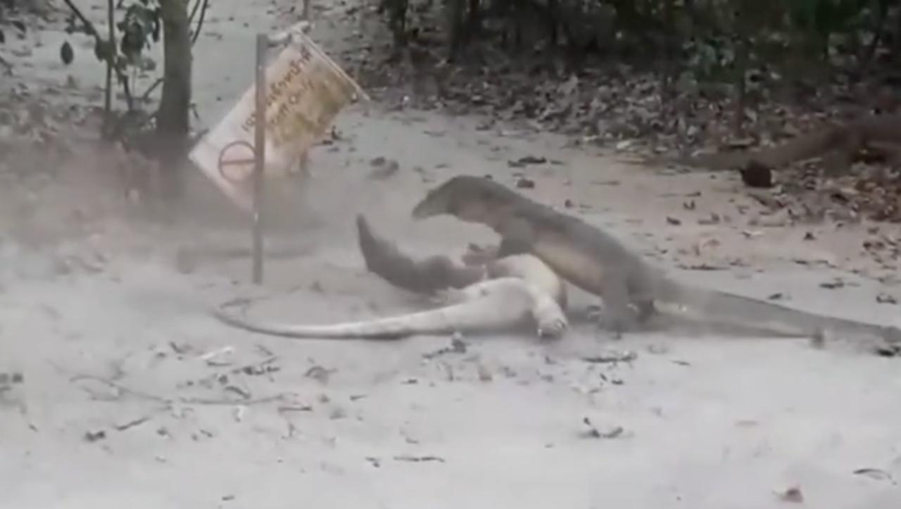 เมื่อวันที่ 23 มี.ค.63 ผู้สื่อข่าวรายงานว่า เจ้าหน้าที่อุทยานแห่งชาติธารโบกขรณี จ.กระบี่ ได้บันทึกภาพวิดีโอนาทีที่ตะกวดยักษ์ยาวประมาณ 1.5 เมตร จำนวน 3 ตัว กำลังต่อสู้ตะลุมบอนกันจนฝุ่นตลบบนผืนทราย บริเวณชายหาดบนเกาะห้อง ในเขตอุทยานแห่งชาติธารโบกขรณี ที่ ต.เขาทอง อ.เมืองกระบี่ แหล่งท่องเที่ยวชื่อดังของ จ.กระบี่ โดยตะกวดยักษ์ทั้ง 3 ตัวนั้น กอดรัดฟัดเหวี่ยงกัดกันนานกว่า 10 นาที ก่อนที่ 1 ตัวจะแยกออกไป เหลืออีก 2 ตัวที่ต่อสู้กันต่อนานอีกกว่า 10 นาที จนทั้ง 2 ตัว แยกย้ายกันออกไปจากจุดดังกล่าว