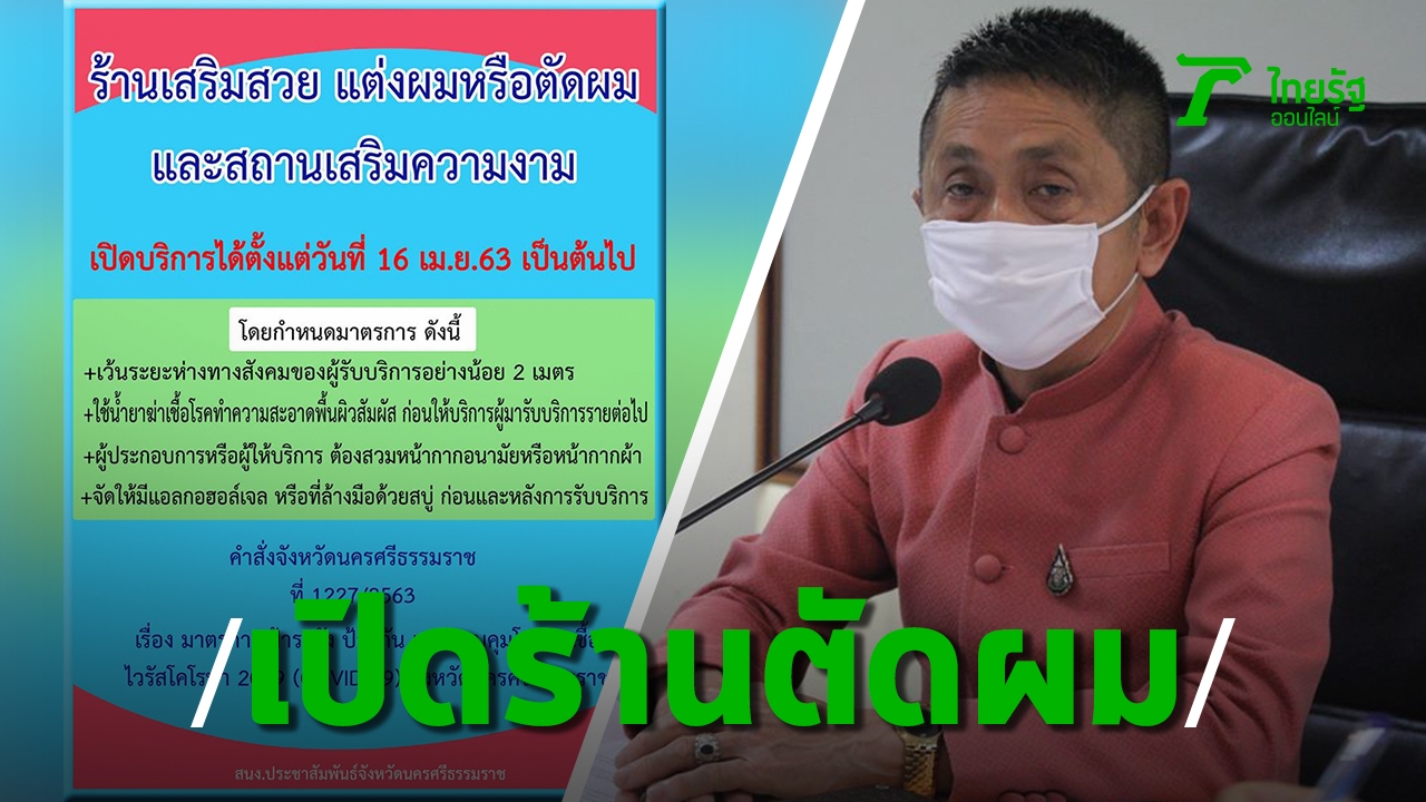 เมื่อวันที่ 10 เม.ย.63 นายศิริพัฒ พัฒกุล ผวจ.นครศรีธรรมราช เผยว่า ในฐานะผู้กำกับบริหารราชการในสถานการณ์ฉุกเฉินจังหวัดนครศรีธรรมราช ได้ลงนามในคำสั่งของจังหวัดที่ 1227/2563 อนุญาตให้ ร้านตัดผมหรือแต่งผม ร้านเสริมสวย และสถานเสริมความงาม ในจังหวัด สามารถเปิดให้บริการกับลูกค้าได้ ตั้งแต่วันที่ 16 เม.ย.63