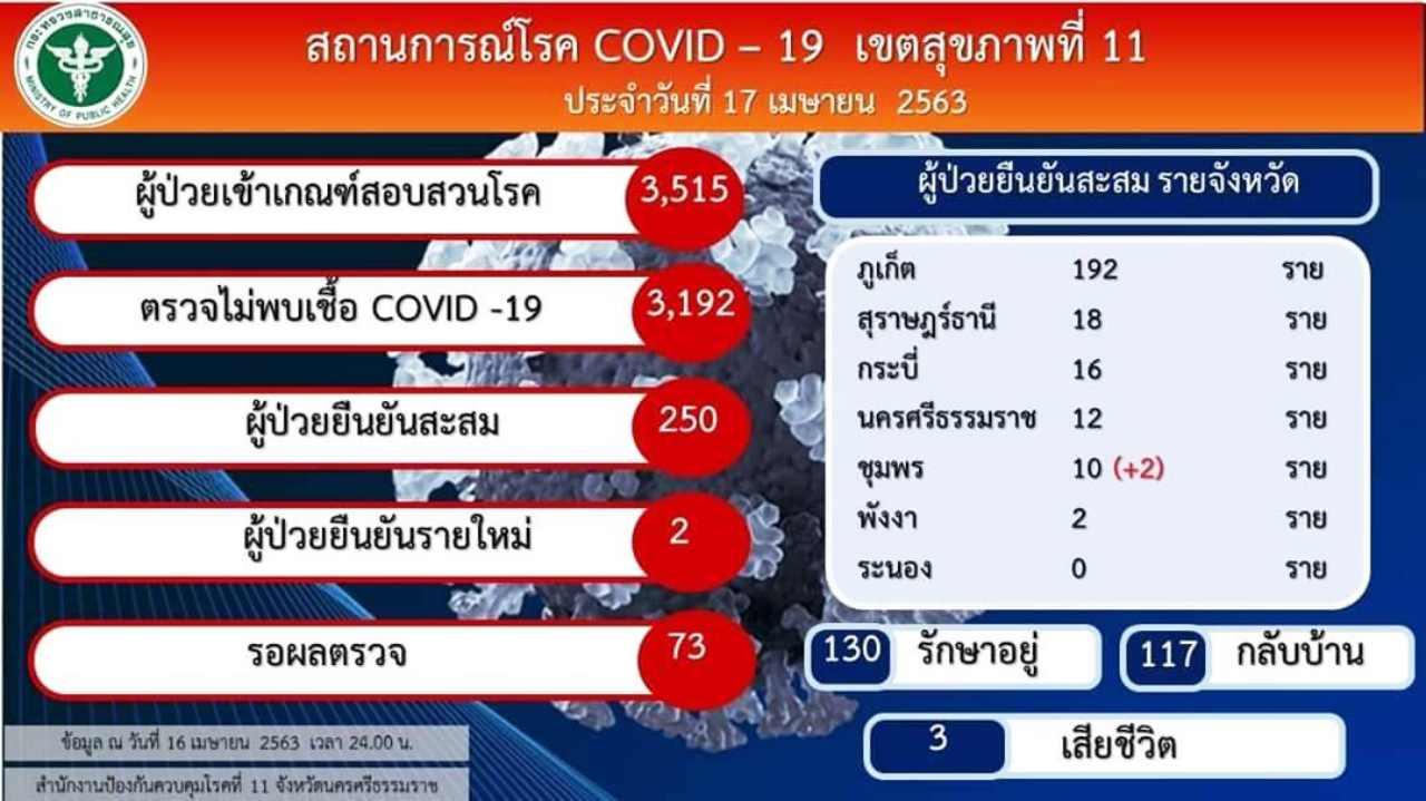 ชุมพรพบผู้ติดเชื้อโควิด-19 เพิ่มอีก 2 ยอดสะสมรวม 10 คน ตายแล้ว 2 ศพ โดยมีถึง 9 คน ติดเชื้อจากตึกอายุรกรรมหญิง รพ.ชุมพรเขตรอุดมศักดิ์ เริ่มจากผู้ป่วยรายหนึ่งเป็นพาหะ ติดเชื้อแต่ไม่แสดงอาการ พาติดคนอื่น ก่อนแพร่กระจาย พบครอบครัวเดียวป่วยถึง 3 คน