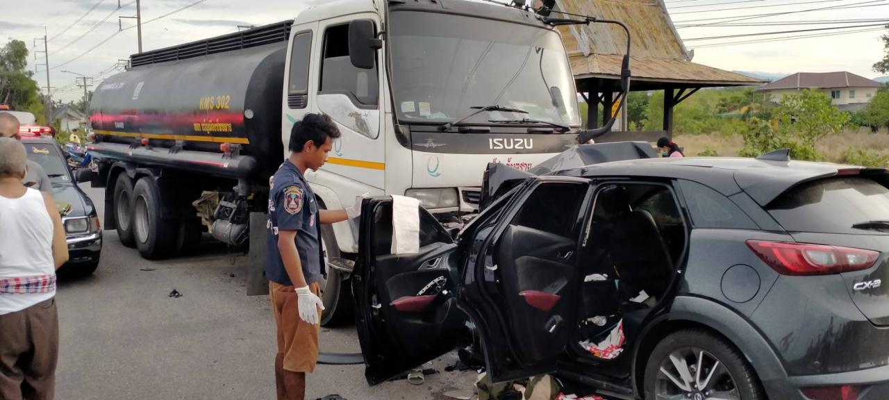 ที่เกิดเหตุริมถนนเอเซีย (41) ฝั่งขาล่องใต้ หน้าศาลาที่พักผู้โดยสาร สี่แยกนาโพธิ์ ม.7 ต.นานอน อ.นาบอน จ.นครศรีธรรมราช พบรถยนต์เก๋งยี่ห้อมาสด้า ซีเอ็กซ์ 3 สีดำ ทะเบียน 6 กค 5246 กรุงเทพมหานคร สภาพชนอัดก๊อบปี้ ด้านหน้ายุบ กระจกด้านหน้าแตก ติดอยู่หน้ารถบรรทุก 10 ล้อ ท้ายบรรทุกน้ำยางมะตอย ยี่ห้ออีซูซุ สีขาว ทะเบียน 70-3027 ชลบุรี ที่จอดอยู่ริมถนนหน้าศาลาพักริมทาง ตรวจสอบภายในห้องโดยสารรถยนต์เก๋ง พบผู้เสียชีวิตถูกอัดก๊อบปี้คาซากรถ 2 ราย ทราบชื่อ น.ส.สุดใจ จันทร์พุ่ม อายุ 48 ปี อยู่บ้านเลขที่ 129/64 หมู่ 1 ต.หนองขาม อ.ศรีราชา จ.ชลบุรี นอนเสียชีวิตฝั่งคนขับ สภาพศพถูกอัดกับพวงมะลัย เลือดใหลออกทางปาก จมูก ส่วนฝั่งที่นั่งหน้าข้างคนขับพบผู้เสียชีวิตทราบชื่อ ด.ช.โมกข์ ดำคง อายุ 10 ปี อยู่บ้านเลขที่ 129/64 หมู่ 1 ต.หนองขาม อ.ศรีราชา จ.ชลบุรี มีบาดแผลที่ศีรษะด้านขวาเปิดเป็นแผลกว้าง ซึ่งผู้เสียชีวิตทั้งสองเป็นแม่ลูกกัน