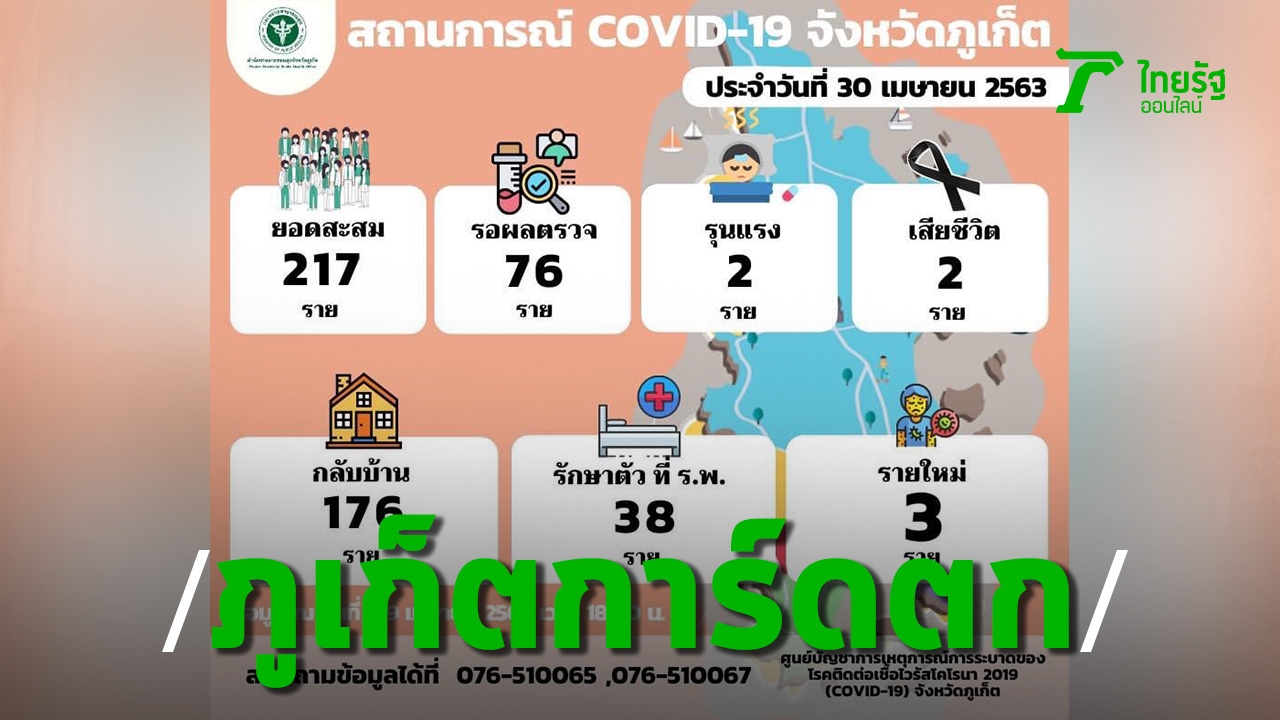 เมื่อวันที่ 30 เม.ย.63 คณะกรรมการโรคติดต่อจังหวัดภูเก็ต รายงานว่า ตั้งแต่วันที่ 5 มกราคม – 29 เมษายน 2563 จังหวัดภูเก็ตมีผู้ติดเชื้อยืนยันโรคโควิด-19 แล้วจำนวน 217 ราย (รายใหม่ 3 ราย) โดยผู้ติดเชื้อได้รับอนุญาตให้กลับบ้าน 176 ราย (เพิ่มขึ้นจากเดิม 3 ราย) เสียชีวิต 2 ราย จำหน่าย 1 ราย (จำหน่าย เนื่องด้วยเสียชีวิตจากอุบัติเหตุรถจักรยานยนต์) กำลังรักษาพยาบาลอยู่ 38 ราย ในจำนวนนี้ อาการรุนแรง 2 ราย ที่เหลืออาการอยู่ในเกณฑ์ที่ดี