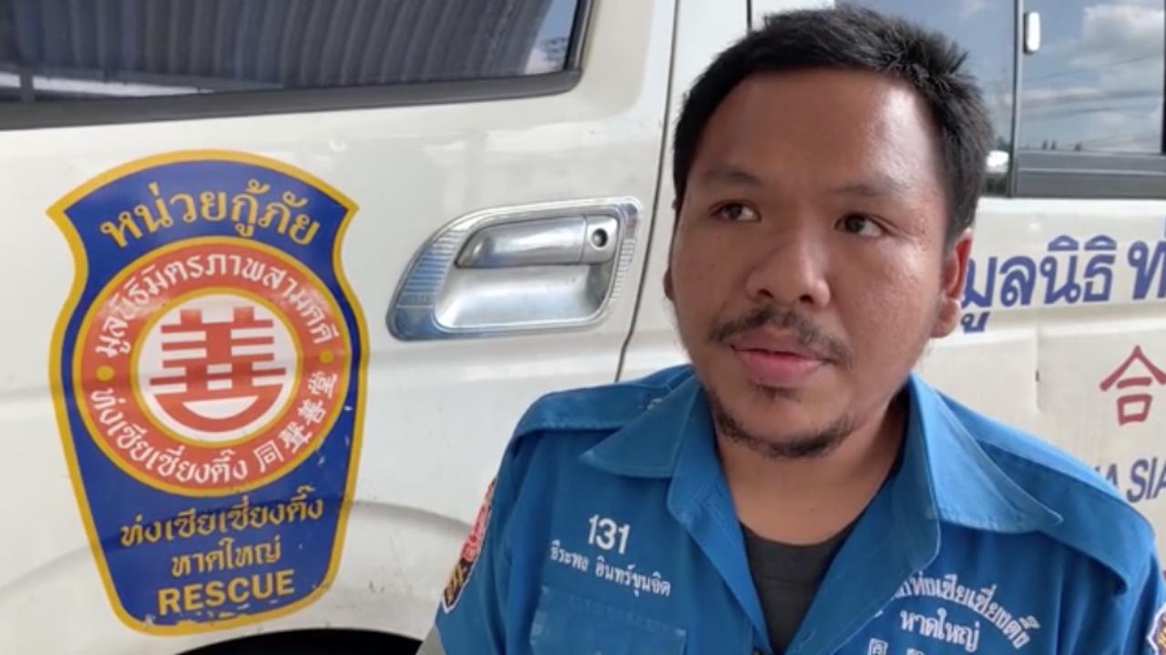 นายธีระพล อินทร์ขุนจิต เจ้าหน้าที่กู้ภัยที่เข้าไปรับตัว กล่าวว่า ตอนแรกได้รับแจ้งจากตำรวจ ว่าให้ไปกับชุดสายตรวจเหตุผู้หญิงคลุ้มคลั่ง พอไปถึงที่เกิดเหตุ มีผู้หญิงคนหนึ่งอายุประมาณ 20 ปี อยู่ในอาการเอะอะโวยวาย แต่ทางตำรวจได้ควบคุมตัวไว้เรียบร้อยแล้ว ทีมกู้ภัยก็ช่วยจับใส่เปล และก็นำส่งโรงพยาบาล เบื้องต้น หญิงสาวรายนี้มีอาการเอะอะโวยวาย แต่ไม่ได้ต่อว่าอะไร จนท.ดูแลคล้ายคนพูดจาไม่รู้เรื่อง โดยเมื่อไปถึงหญิงสาวรายนี้ไม่โป๊แล้ว มีชาวบ้านใส่เสื้อใส่กางเกงให้เรียบร้อย หลังจากขึ้นรถค่อนข้างจะสงบลงกว่าเดิมมาก แต่ก็มีอาการเอะอะโวยวายบ้างเล็กน้อย.