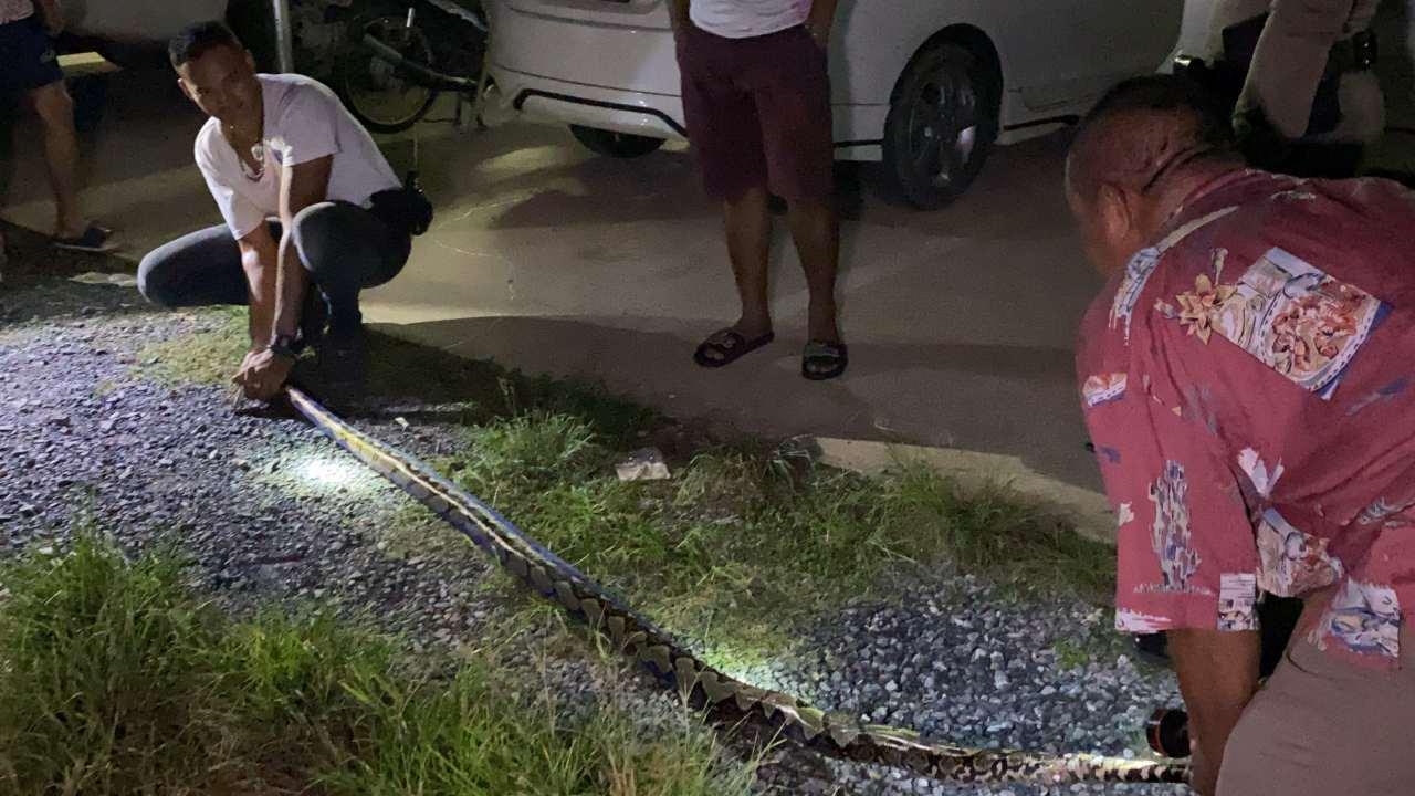 โดยได้รับแจ้งจากนางกชณิภา นิลเขต อายุ 44 ปี เจ้าของบ้านว่า พบงูเหลือมอยู่บนต้นไม้ หลังตรวจสอบพบว่างูตัวดังกล่าวได้แอบเข้ามาขโมยกินไก่ของตัวเองที่เลี้ยงไว้ภายในคอกหลังบ้าน ตายไป 4 ตัว