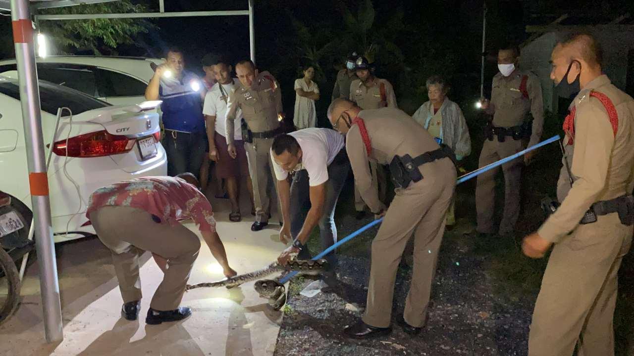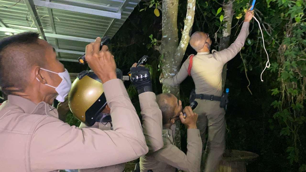 เจ้าหน้าที่ตำรวจ สภ.เมืองพัทลุง ยกกำลังกว่า 15 นาย บุกจับงูเหลือมเข้ามาขโมยกินไก่ชาวบ้านบนต้นไม้ตายไป 4 ตัว