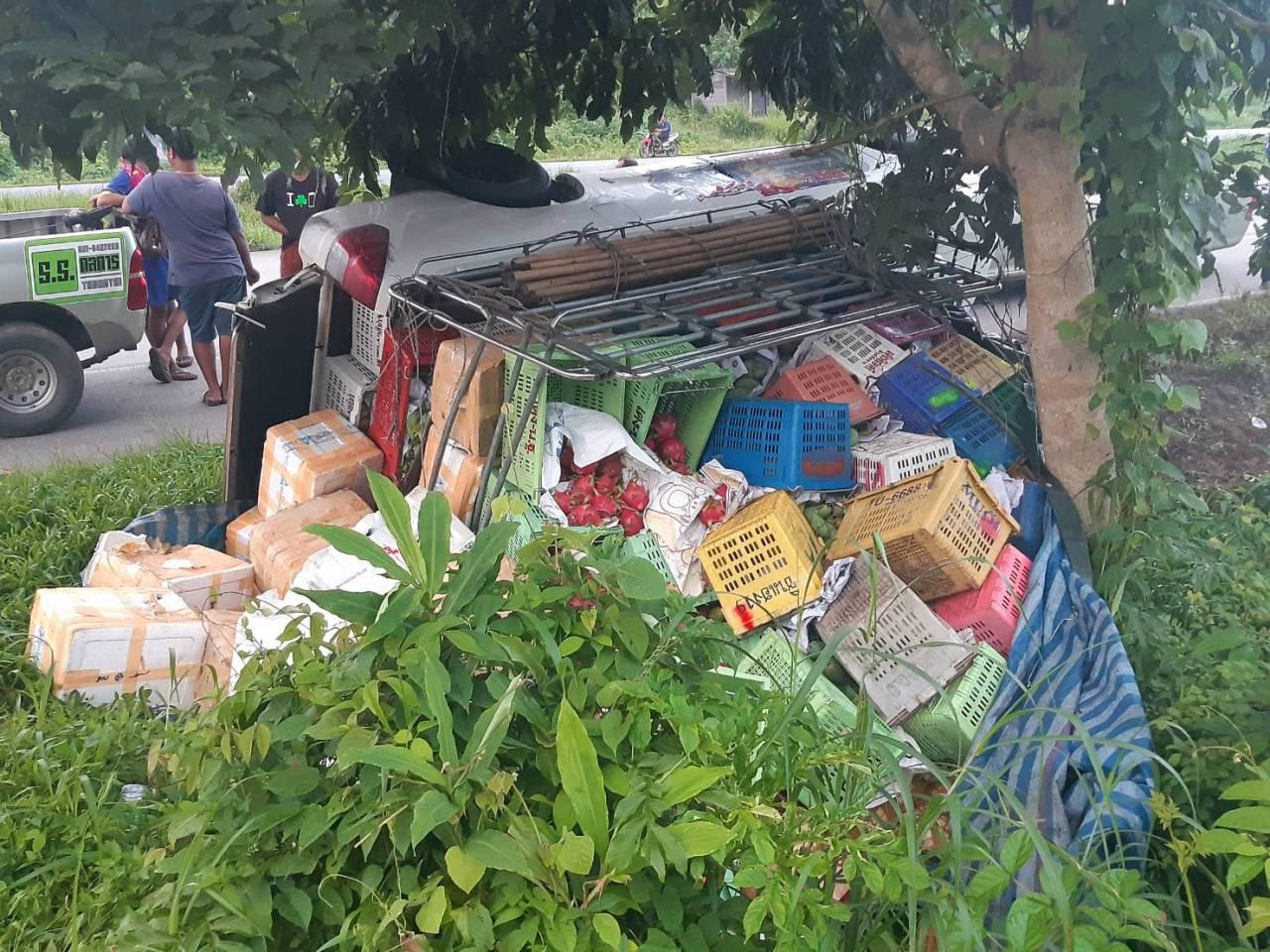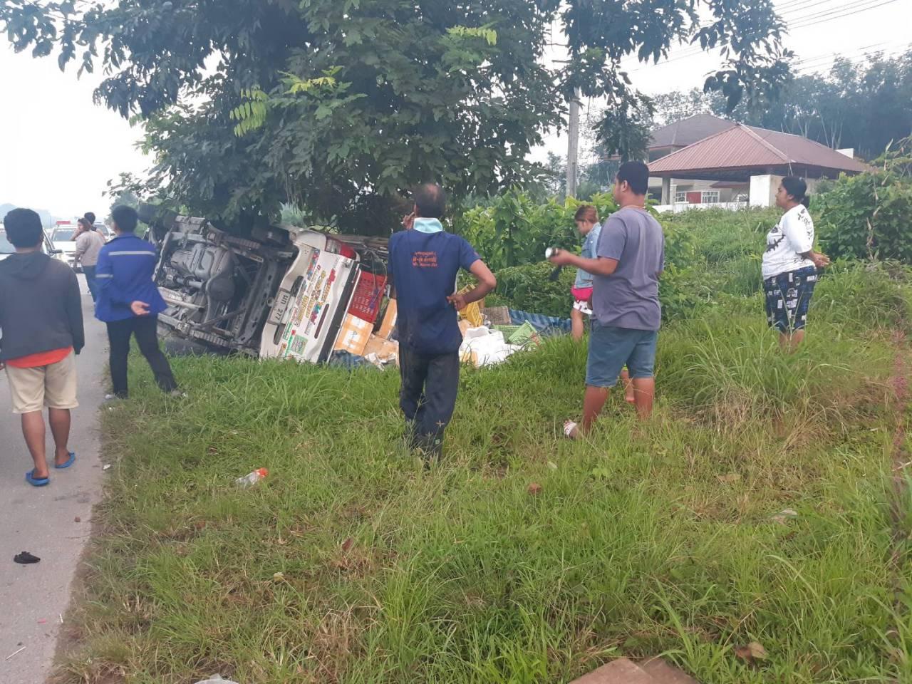 เมื่อเวลา 06.00 น.วันที่ 11 ส.ค. พ.ต.ต.ธวัชชัย อมรชาติ สว.(สอบสวน) สภ.ทุ่งใหญ่ จ.นครศรีธรรมราช รับแจ้งเกิดอุบัติเหตุรถกระบะบรรทุกผัก-ผลไม้ พลิกคว่ำคนขับบาดเจ็บ ผักและผลไม้ที่บรรทุกมาเสียหาย เหตุเกิดบนถนนสายเอเซียฝั่งขาล่อง หมู่ 7 บ้านกองหิน ต.ปริก หลังรับแจ้งรุดไปตรวจสอบพร้อมด้วยมูลนิธิศรัทธาสามัคคีการกุศลจุดหน้าเกษตร และองศารถยกมูลนิธิกู้ภัยช้างเผือก