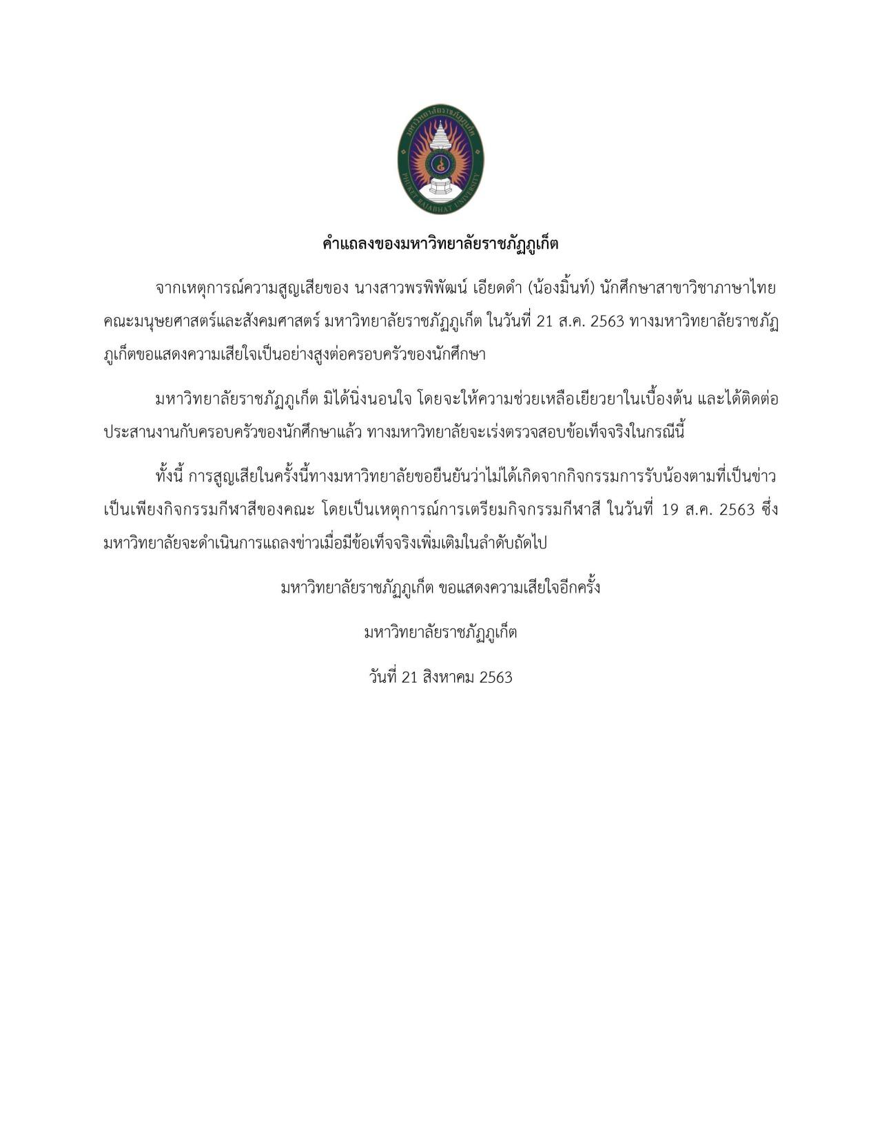 ราชภัฏภูเก็ต แถลงชี้แจง กรณีนักศึกษาสาว วิ่งแล้วช็อก ก่อนไปเสียชีวิตที่โรงพยาบาล ยันไม่ใช่กิจกรรมรับน้อง แต่เป็นการซ้อมเชียร์ลีดเดอร์ ตั้งกรรมการสอบข้อเท็จจริง หากพบใครผิด ลงโทษวินัย