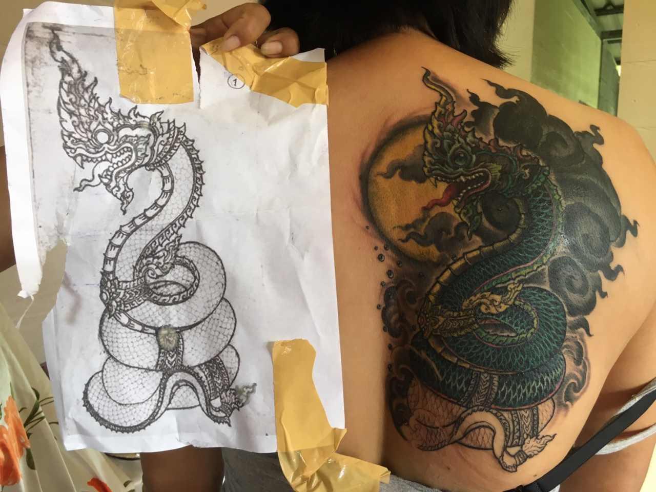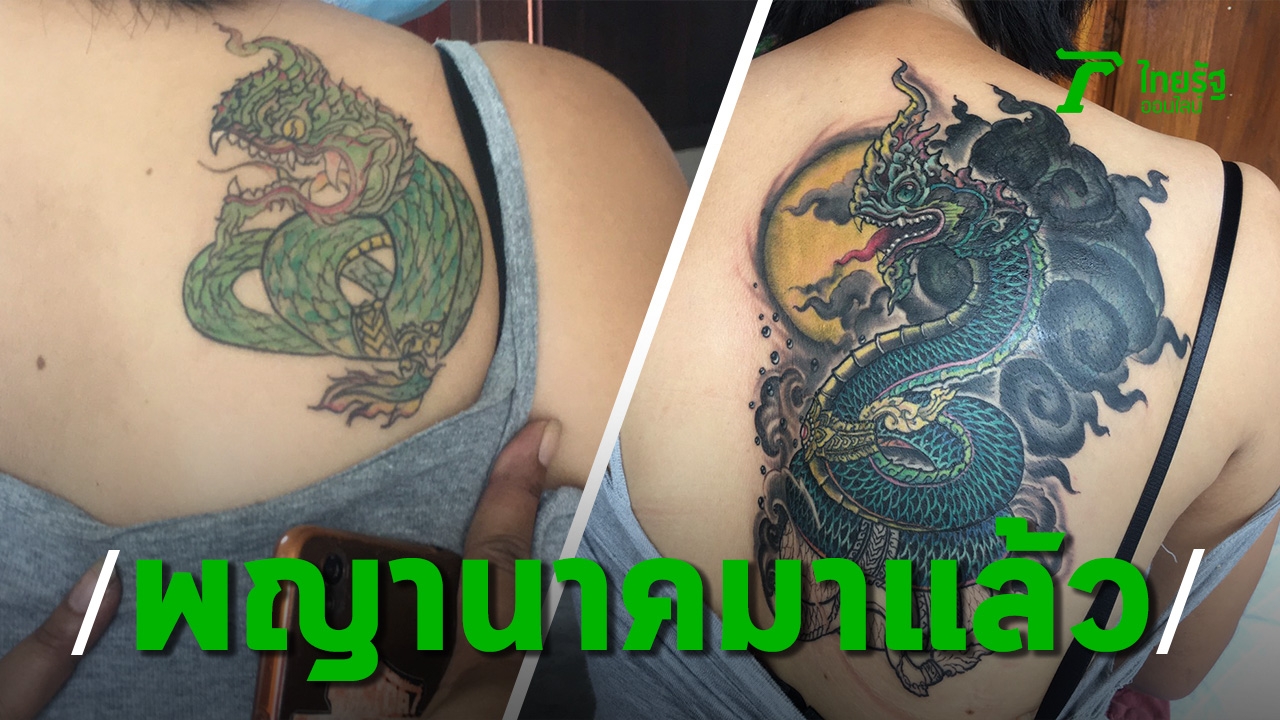 สาวสักลายยิ้มได้ สุดยอดฝีมือช่างแทททูจากชมรมช่างสักอาชีพแห่งประเทศไทย เดินทางมาสักแก้ให้ เปลี่ยนงูเขียวให้กลายเป็นพญานาคอย่างที่อยากได้ ออกมาสวยงามถูกใจ เชื่อเป็นนิมิตหมายที่ดี เผยหลังจากบูชาพญานาค โชคดีถูกหวยมา 2 ครั้ง